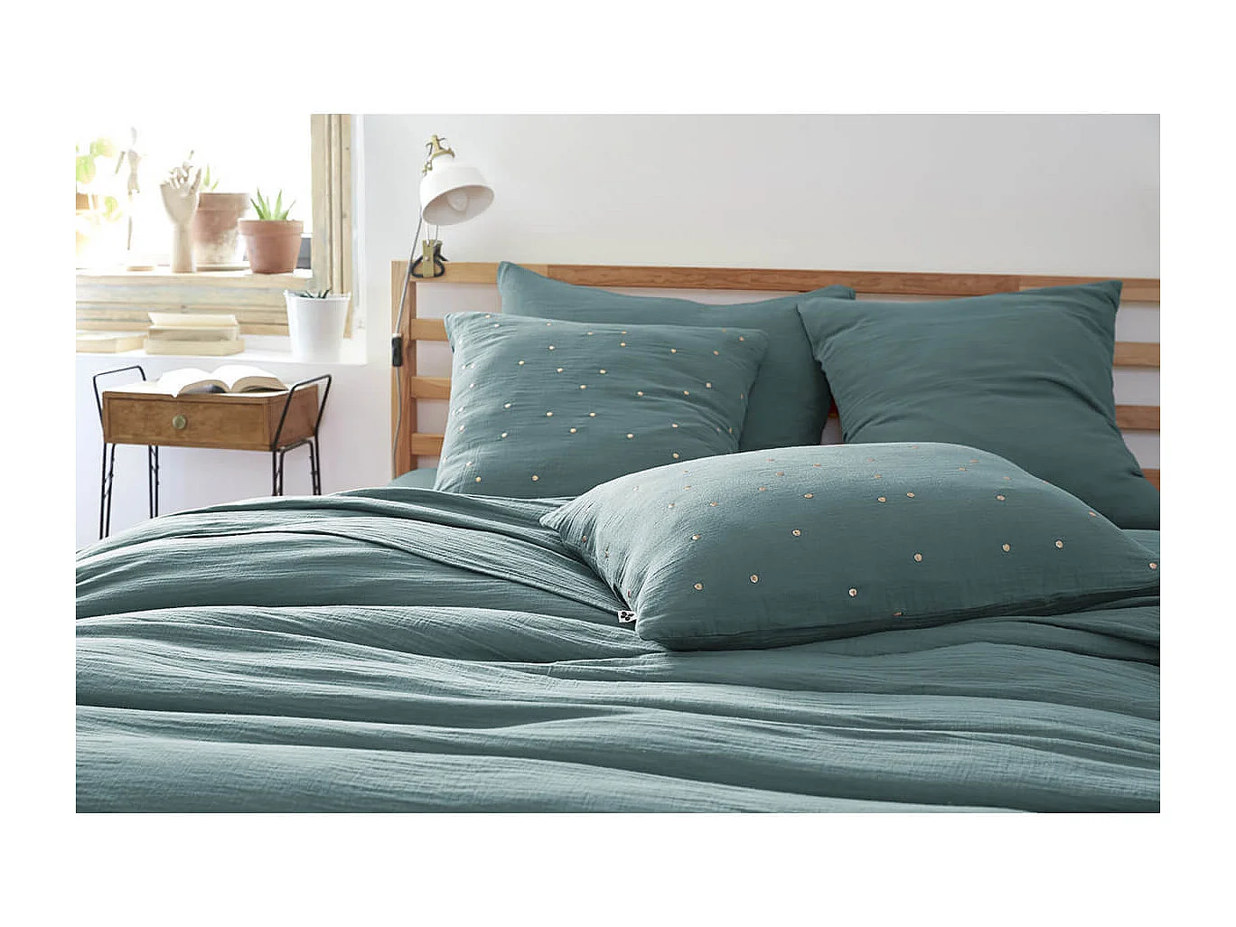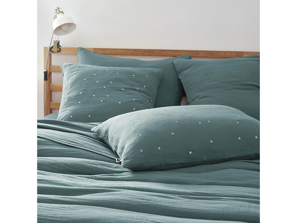 Taie d'oreiller à pois brodés double gaze de coton marine 50x70 cm