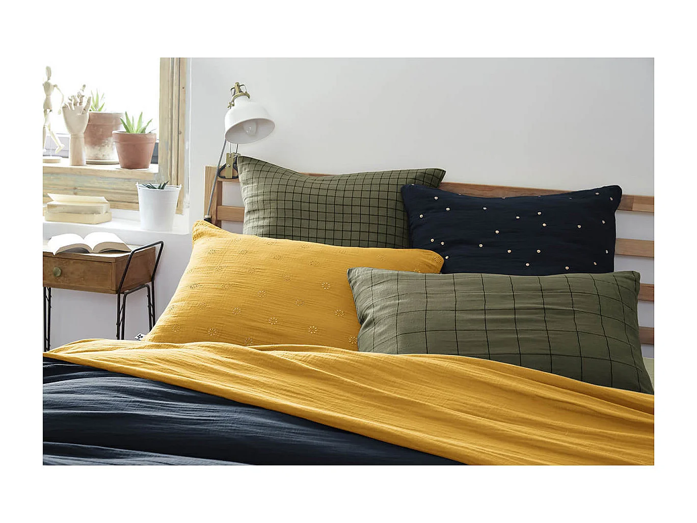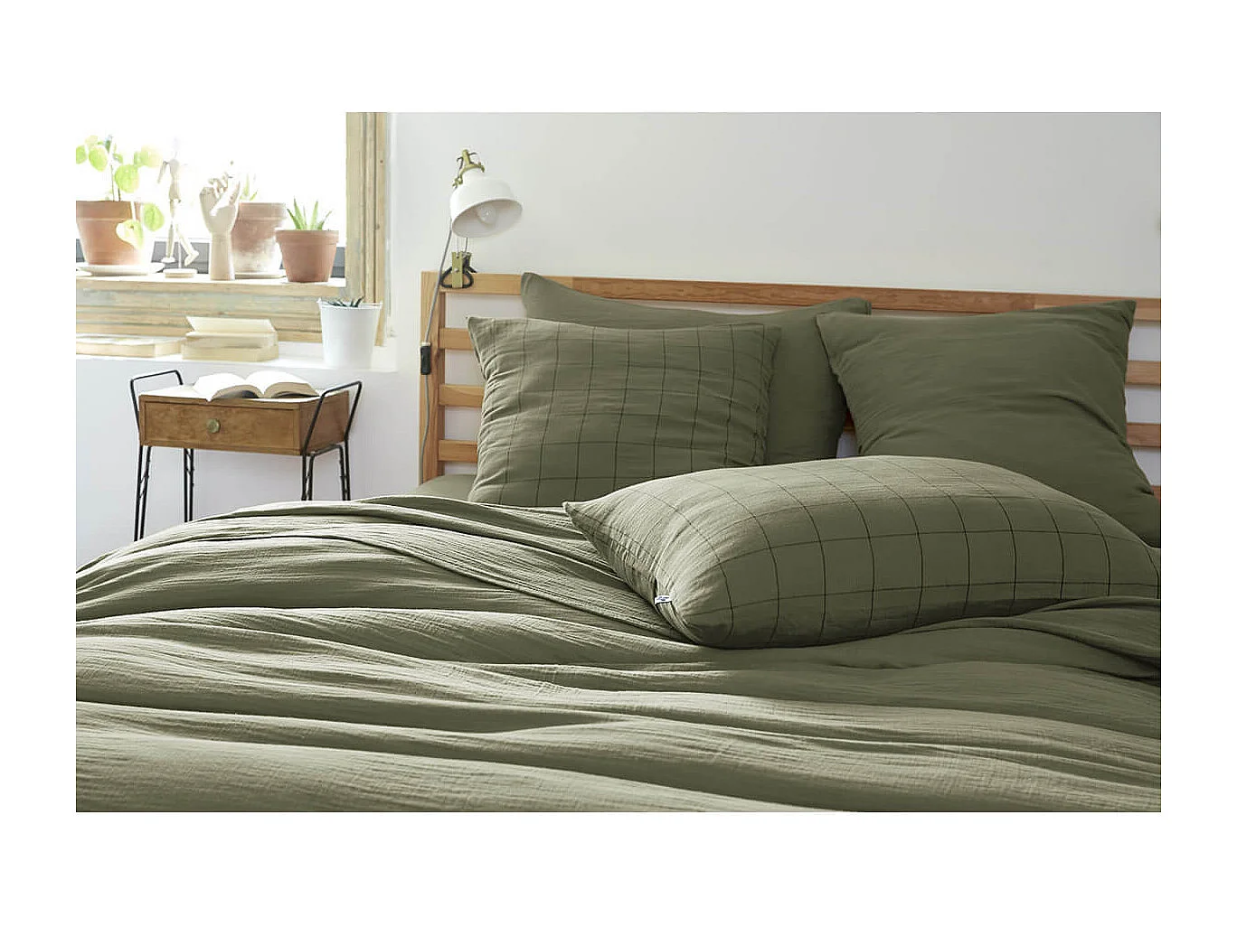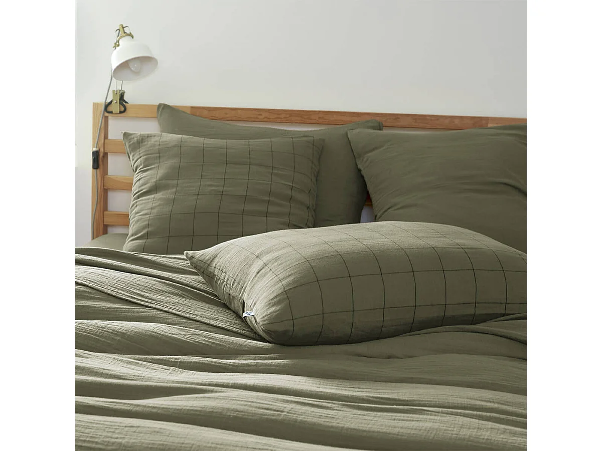 Taie d'oreiller à carreaux double gaze de coton kaki 50x70