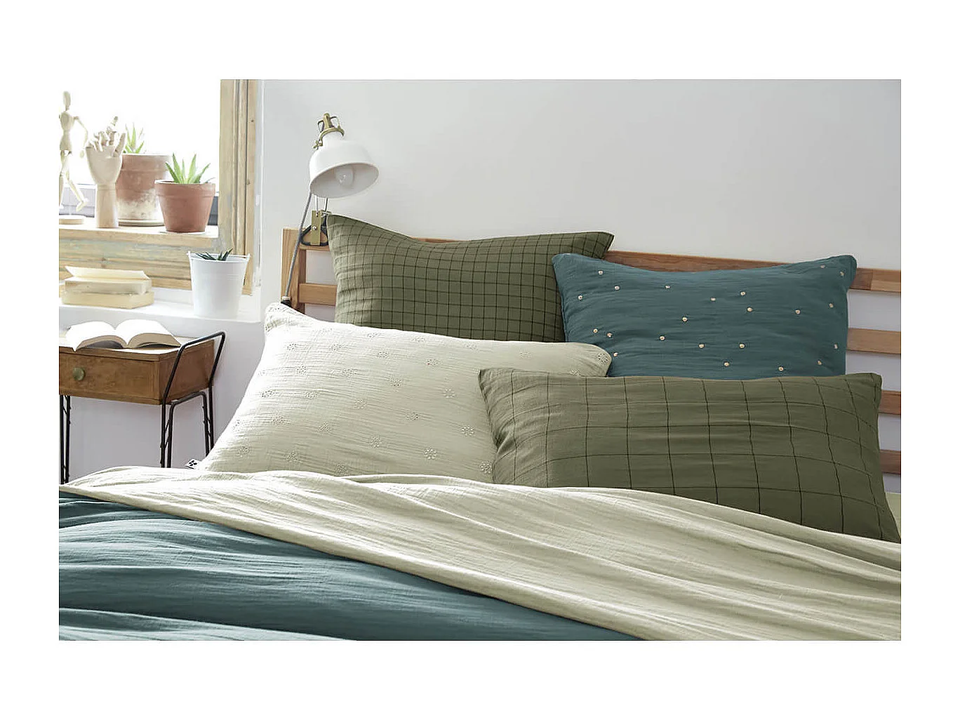 Taie d'oreiller 50x70 double gaze de coton grands carreaux romarin Terre de Nuit