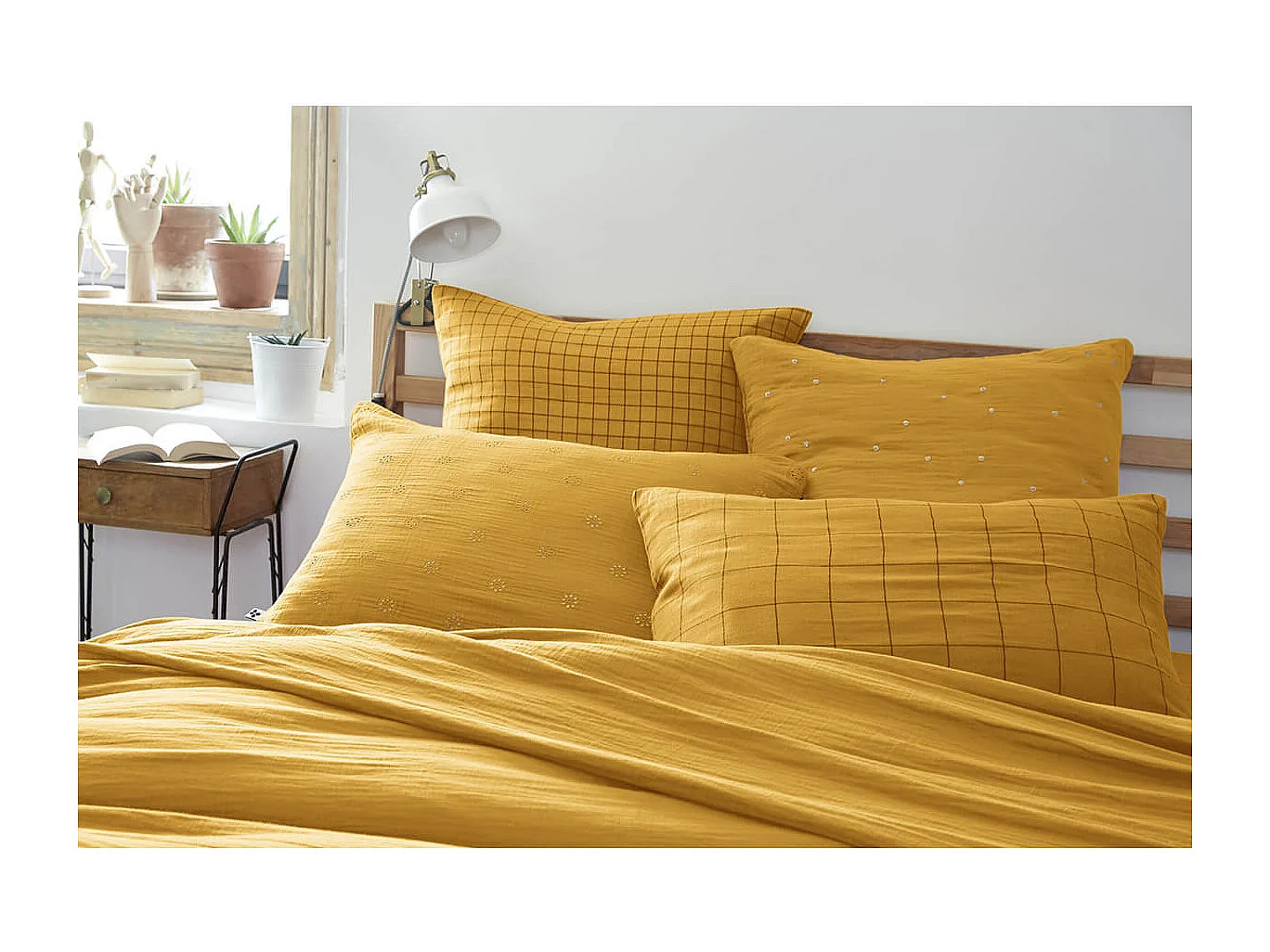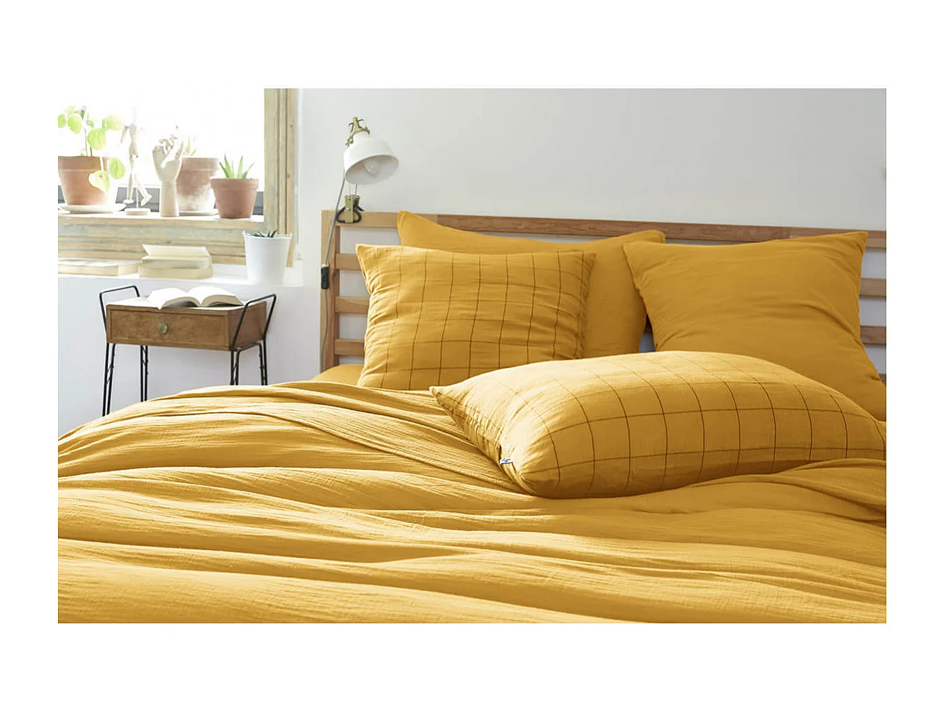 Taie d'oreiller 50x70 double gaze de coton grands carreaux jaune Terre de Nuit