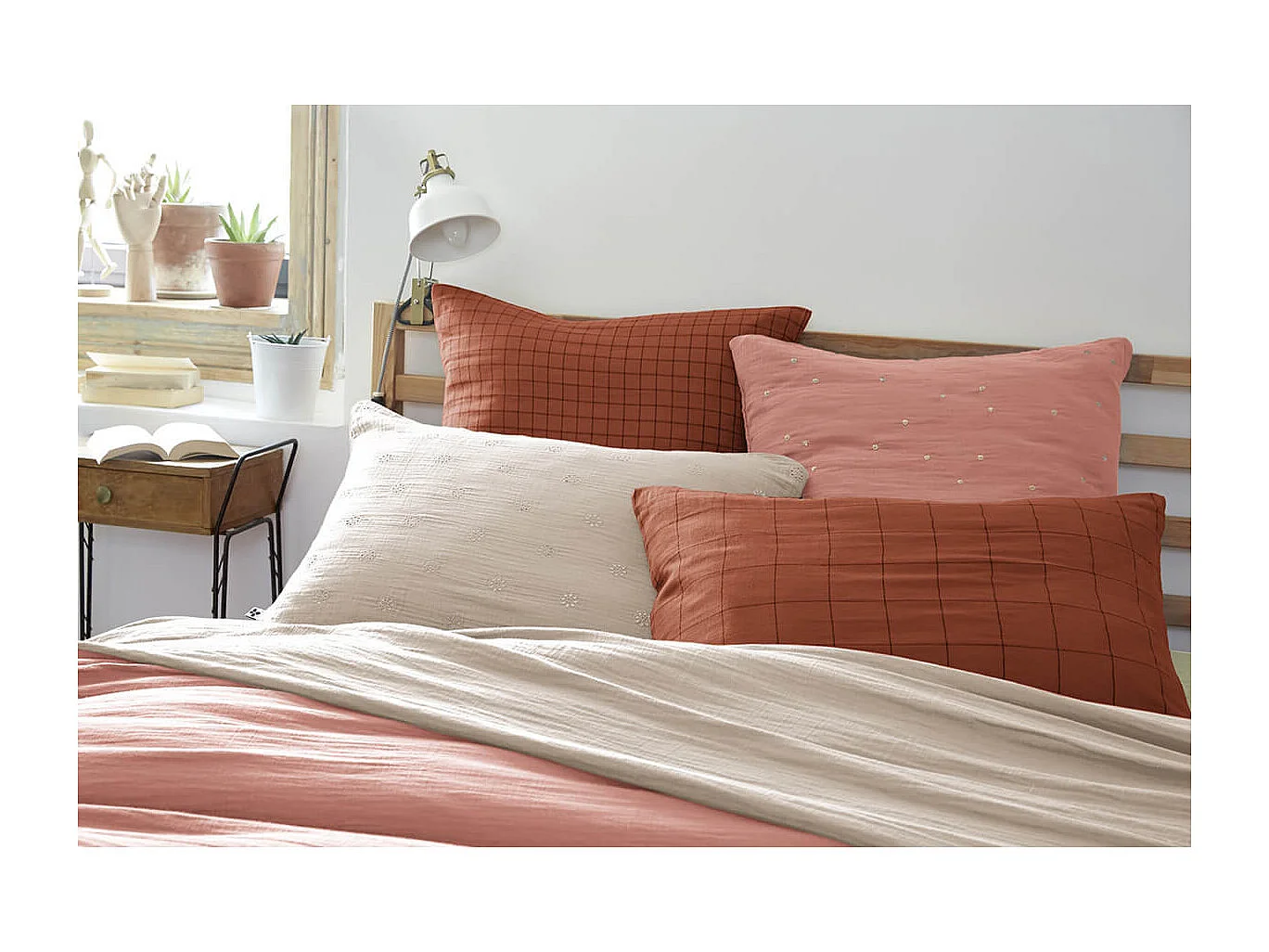 OUREA MOTIF - Taie d'Oreiller 50x70cm Gaze de Coton Terracotta à Petits Carreaux