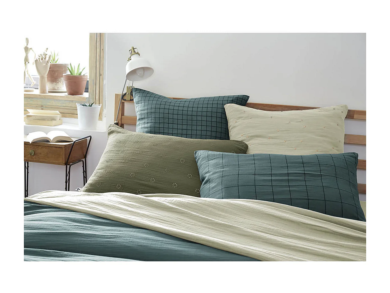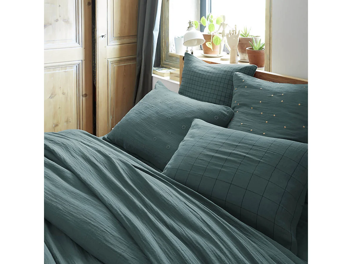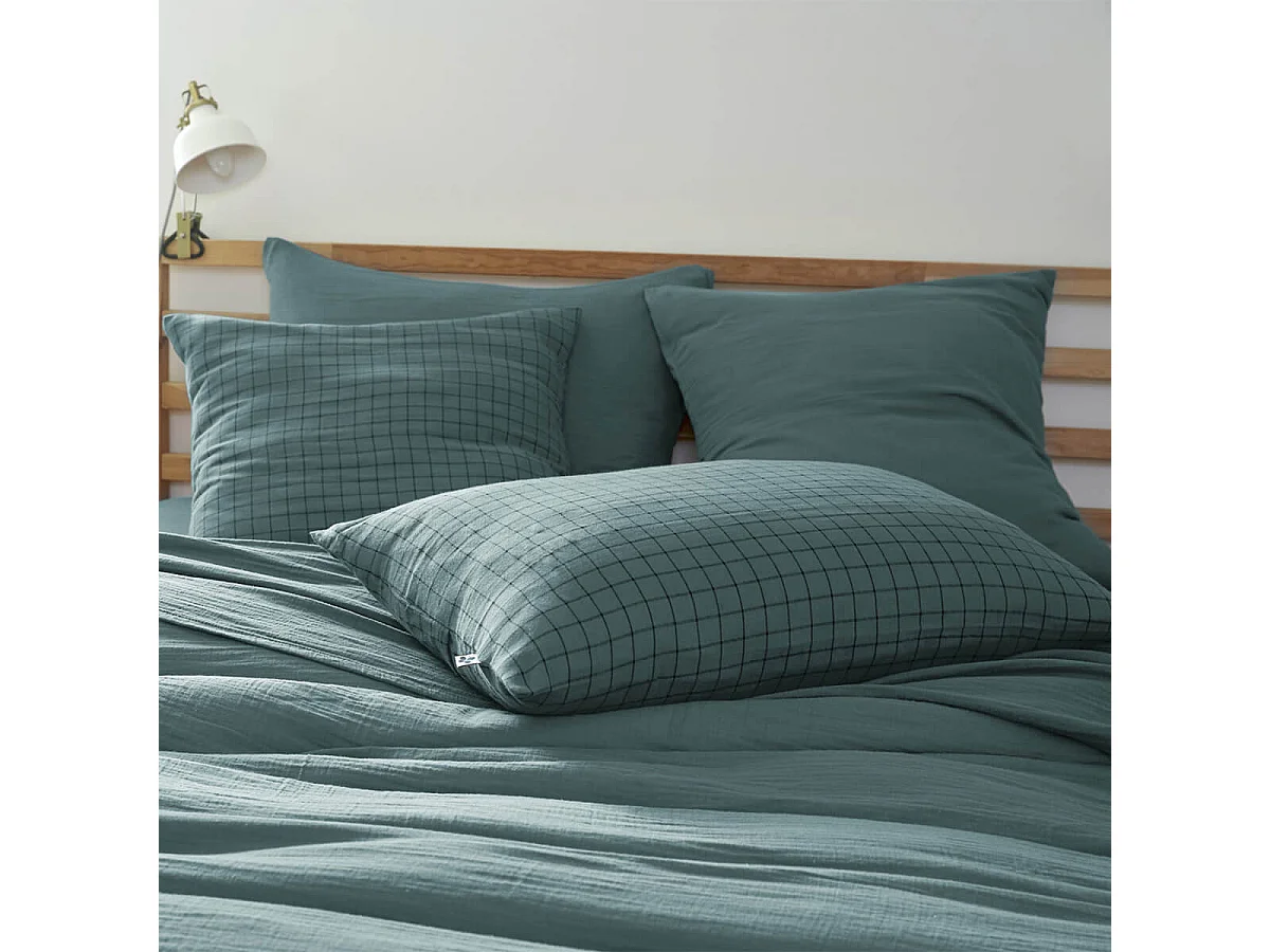 Taie d'oreiller à carreaux double gaze de coton eucalyptus 60x60 cm
