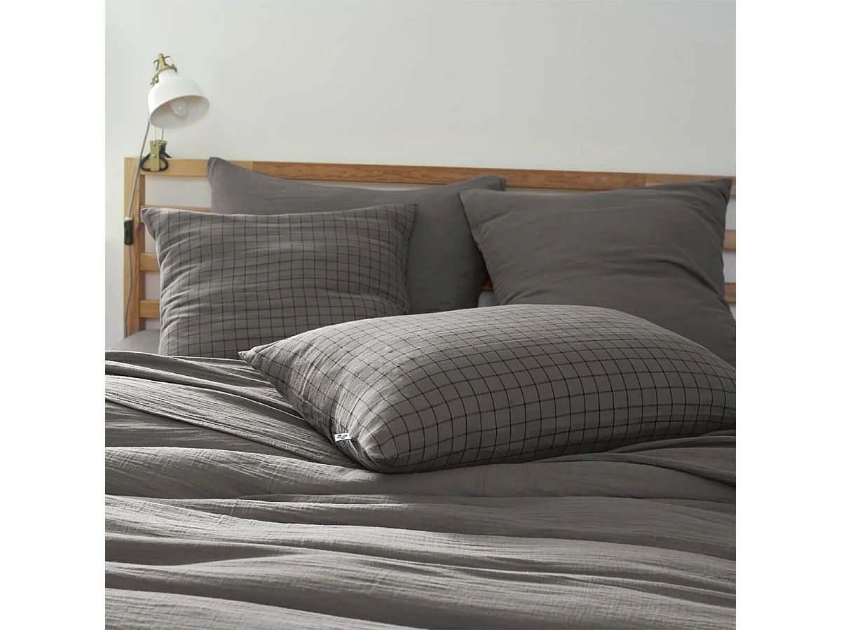 Taie d'oreiller à carreaux double gaze de coton anthracite 50x70