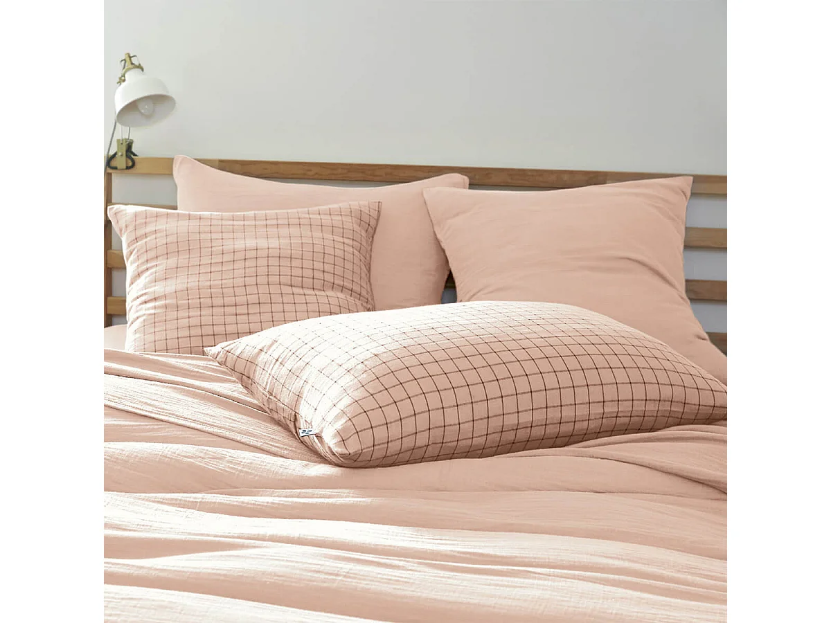 Taie d'oreiller 60x60 double gaze de coton grands carreaux rose pêche Terre de Nuit