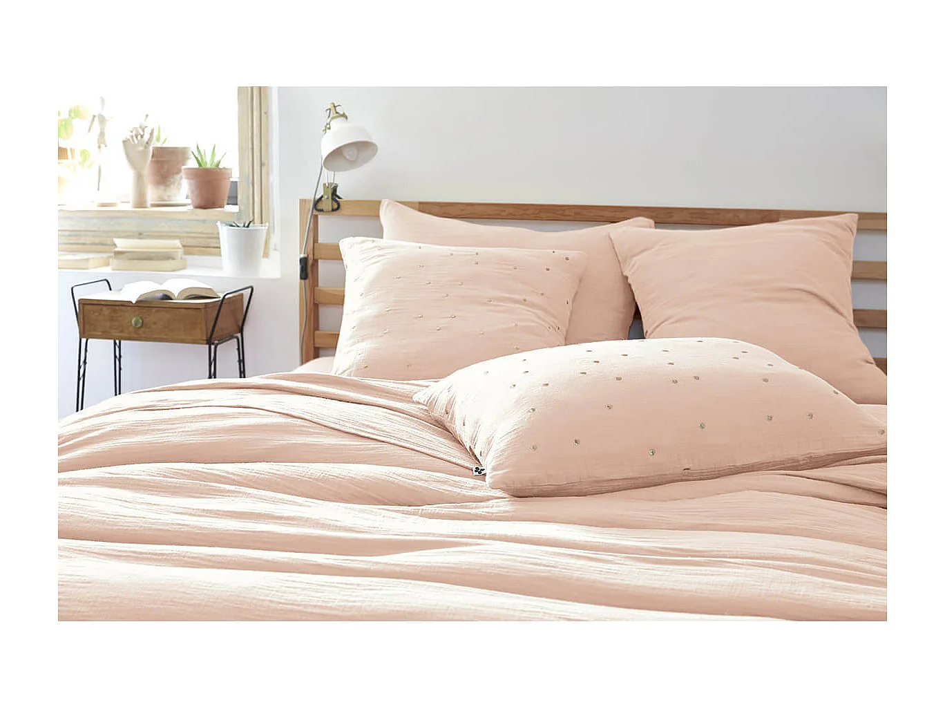 Taie d'oreiller à pois brodés double gaze de coton rose 60x60 cm