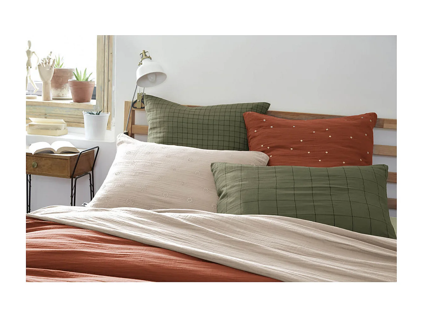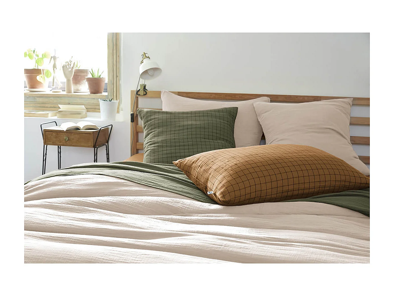 Taie d'oreiller à carreaux double gaze de coton kaki 60x60