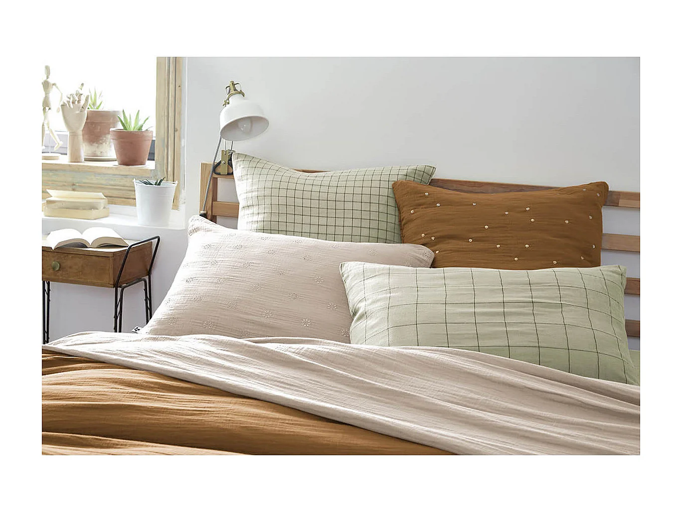 Taie d'oreiller à carreaux double gaze de coton kaki 60x60