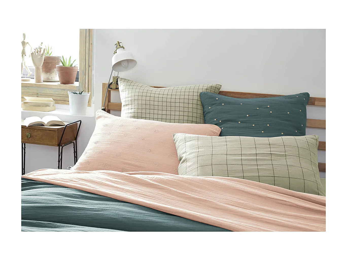 Taie d'oreiller 60x60 double gaze de coton grands carreaux vert d'eau Terre de Nuit