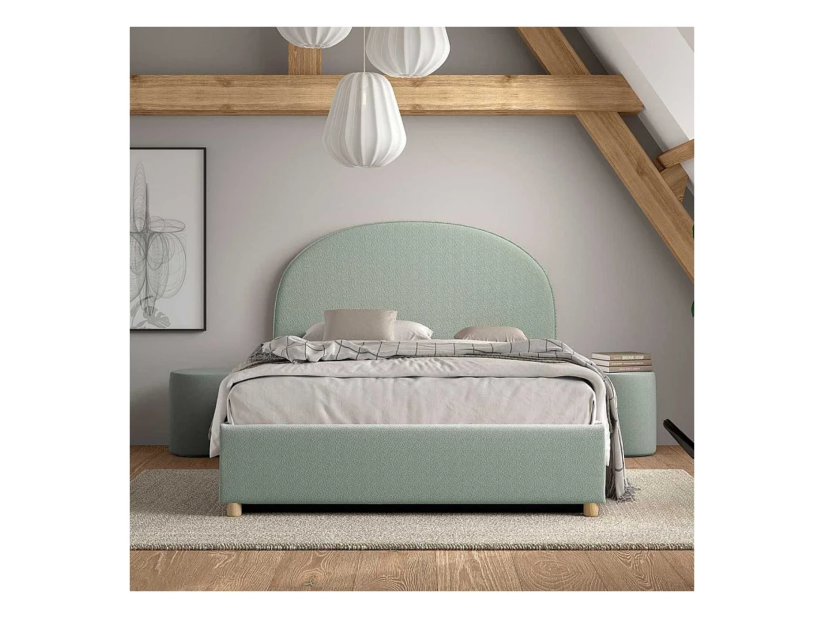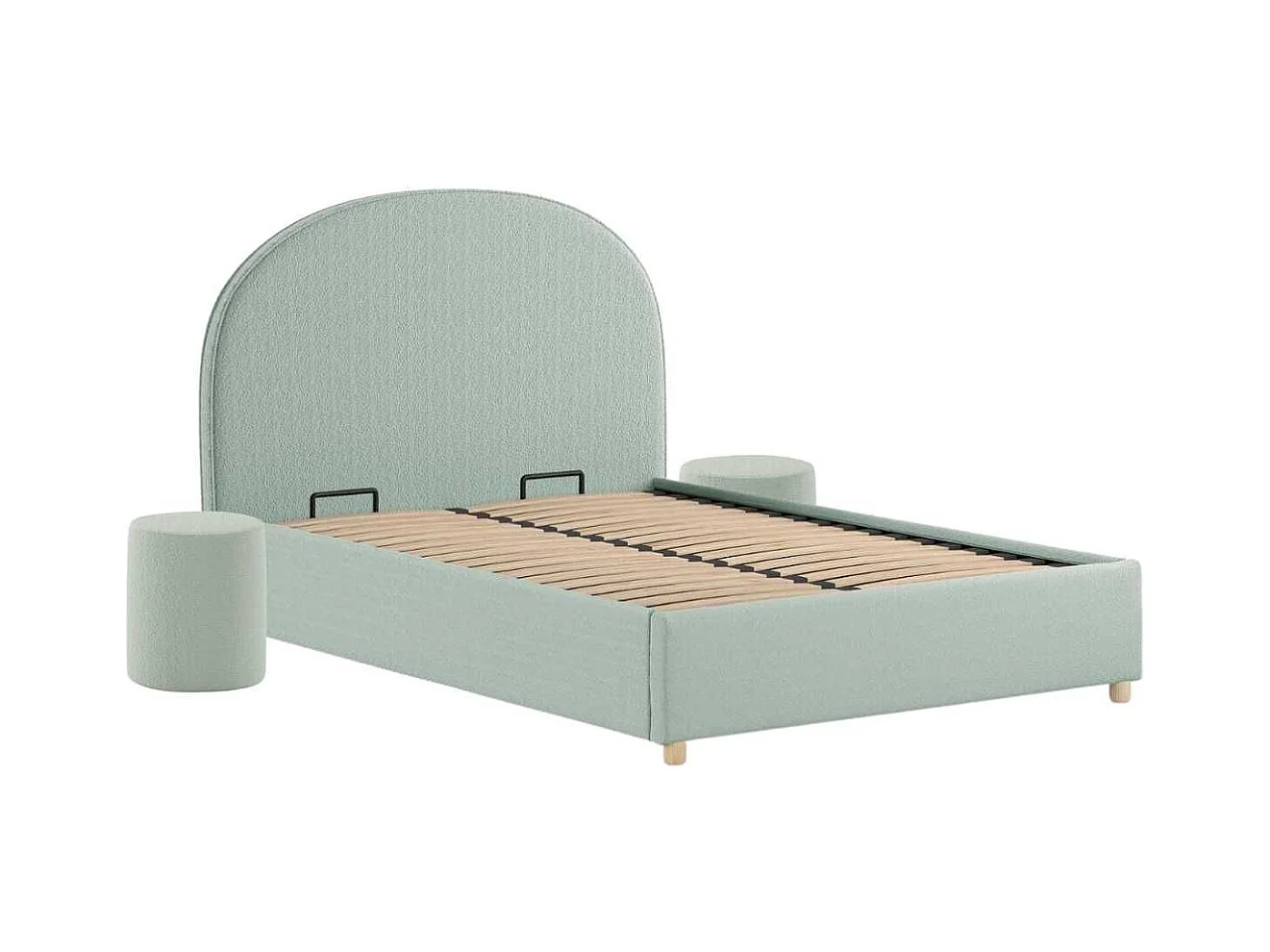 Pack Lit coffre 140x200cm Tête Demi-Lune + 2 Poufs Tissu Bouclé Vert Olive - CONNIE