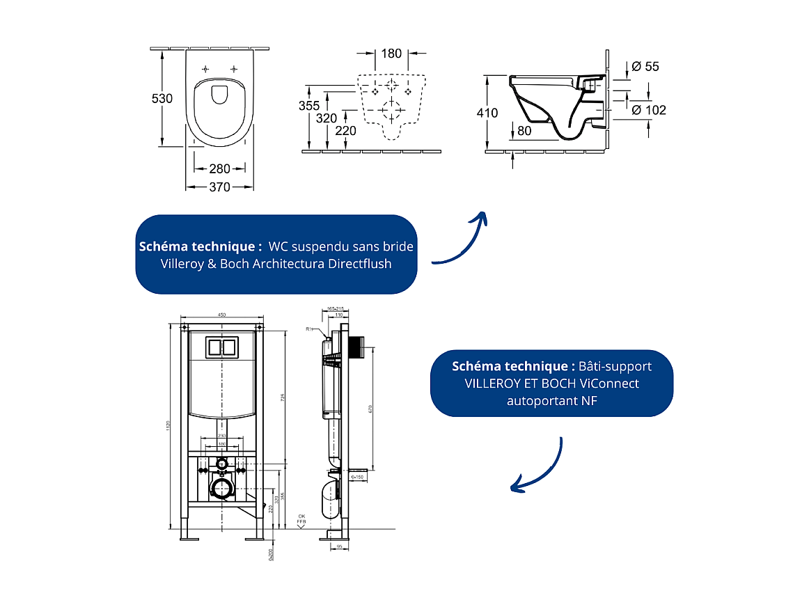 Pack WC suspendu sans bride VILLEROY ET BOCH Architectura directflush + abattant frein de chute + bâti-support autoportant + plaque blanche