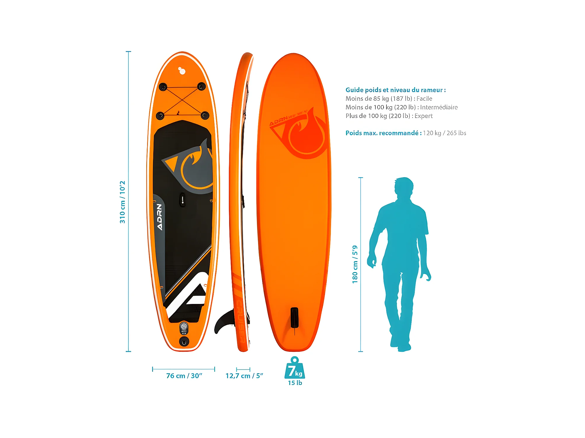 Paddle Gonflable CRUISER 10'2 30'' 5'' (310x76x12,7cm) avec Pompe, Pagaie, Leash et Sac de transport