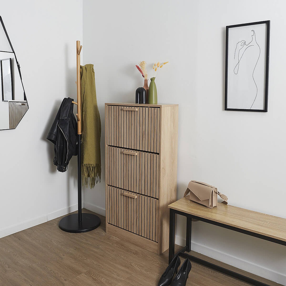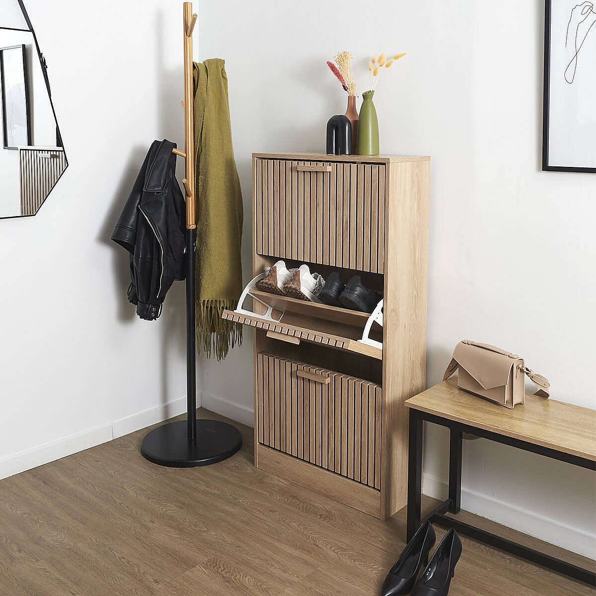 PAJAN - Meuble à Chaussures 3 Portes Basculantes Effet Bois avec Tasseaux