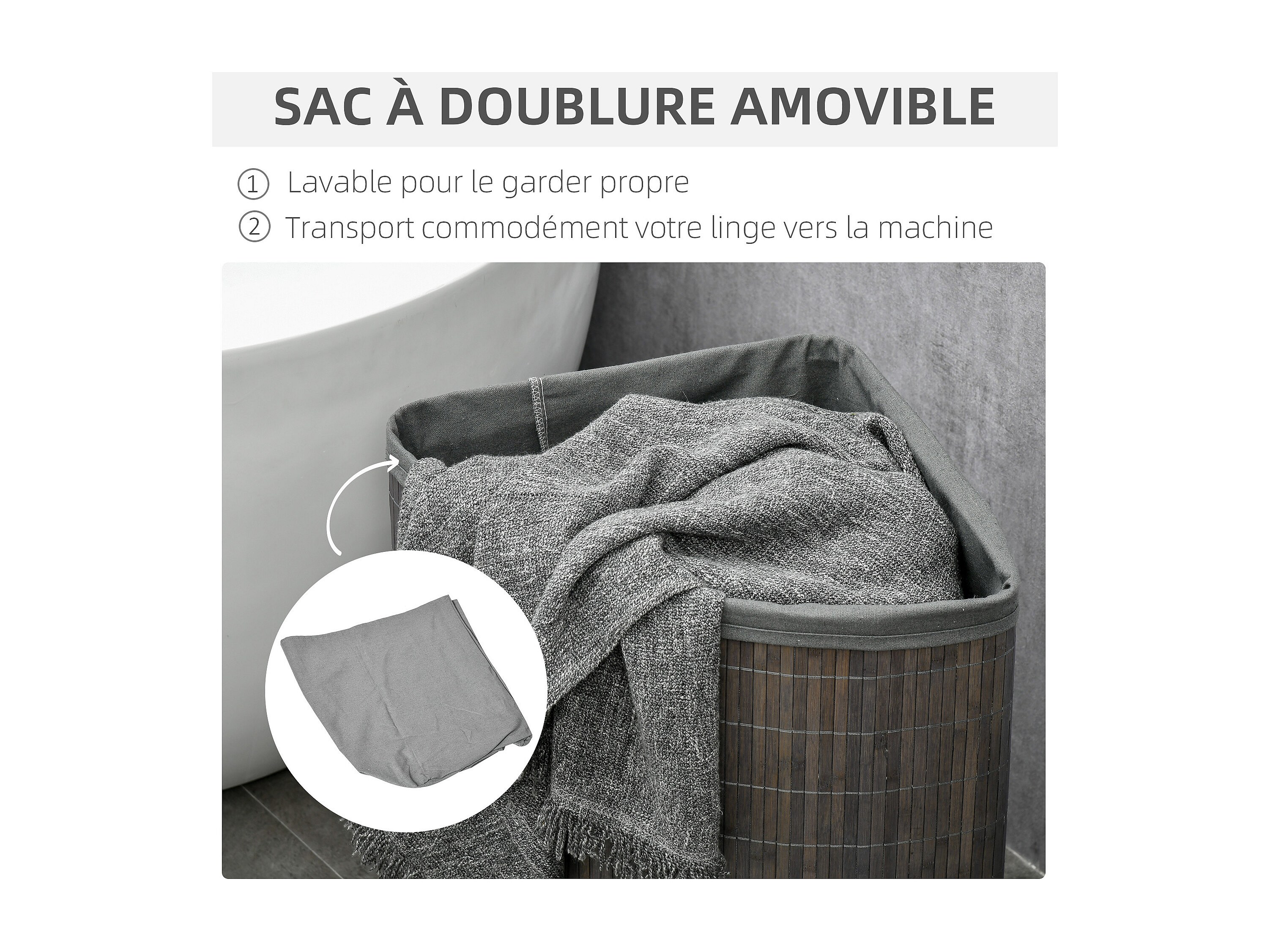 Panier à linge corbeille à linge bac à linge 100 L 2 compartiments couvercle sac amovible 2 poignées tissu bambou