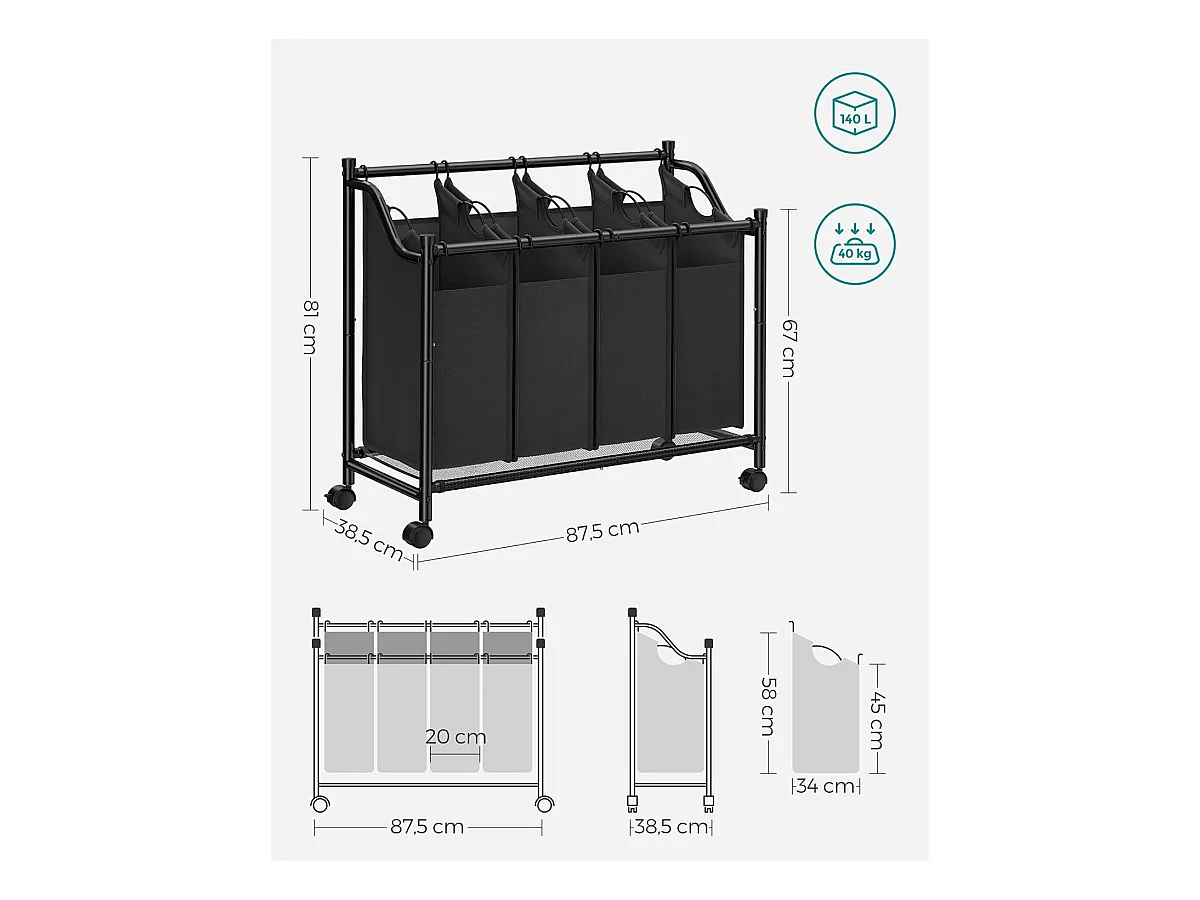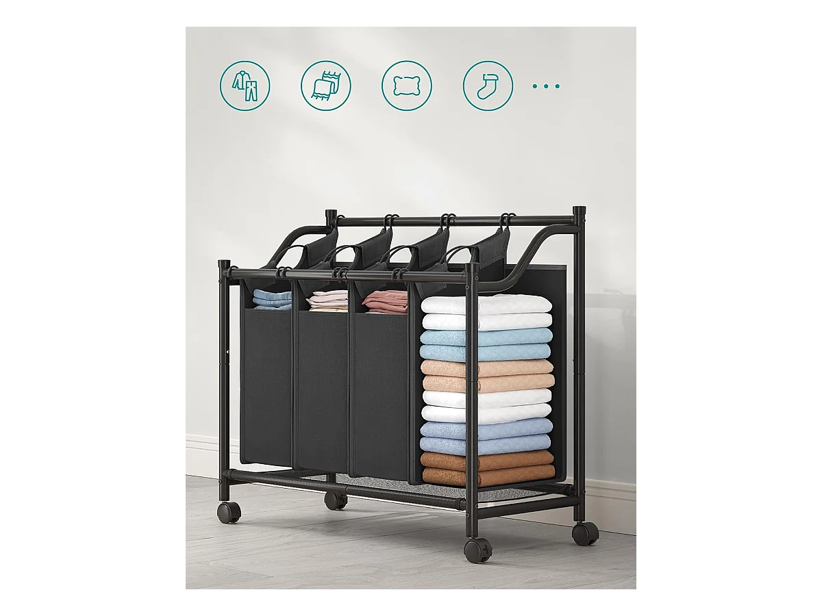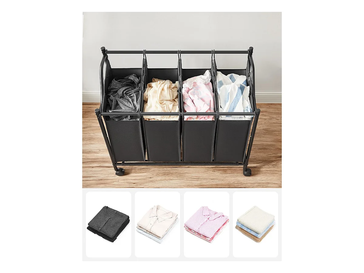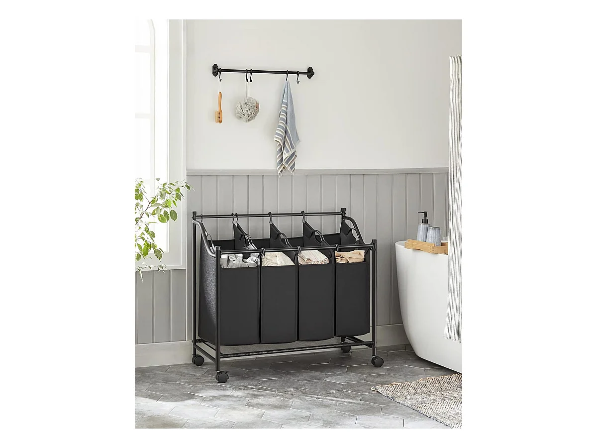 Panier à linge Valora noir à 4 compartiments avec roulettes 140 L