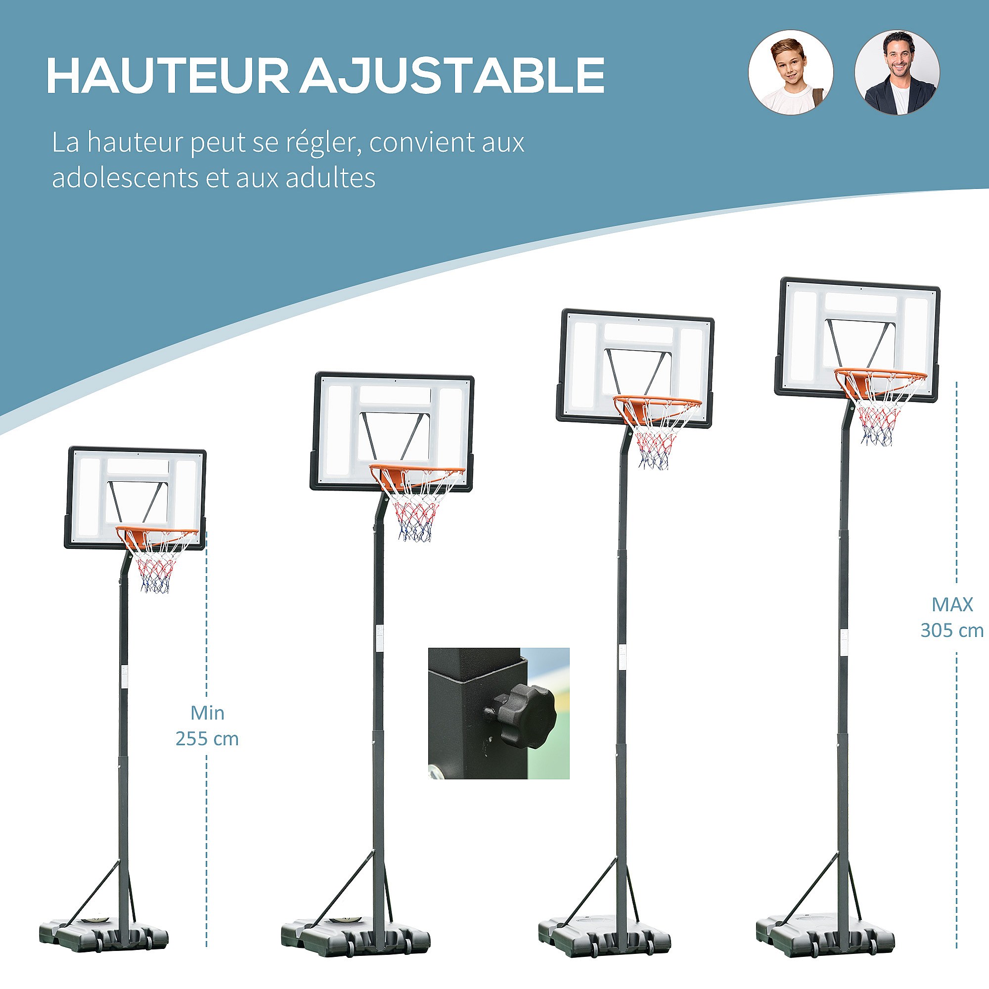 Panier de basket sur pied hauteur réglable 2,35-3,05 m - roulettes, base de lestage - acier PE noir