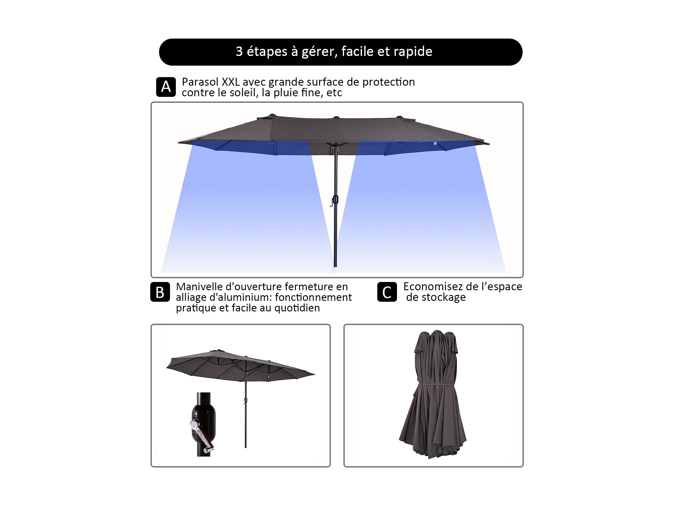Parasol de jardin XXL parasol grande taille 4,6L x 2,7l x 2,4H m ouverture fermeture manivelle acier polyester haute densité gris