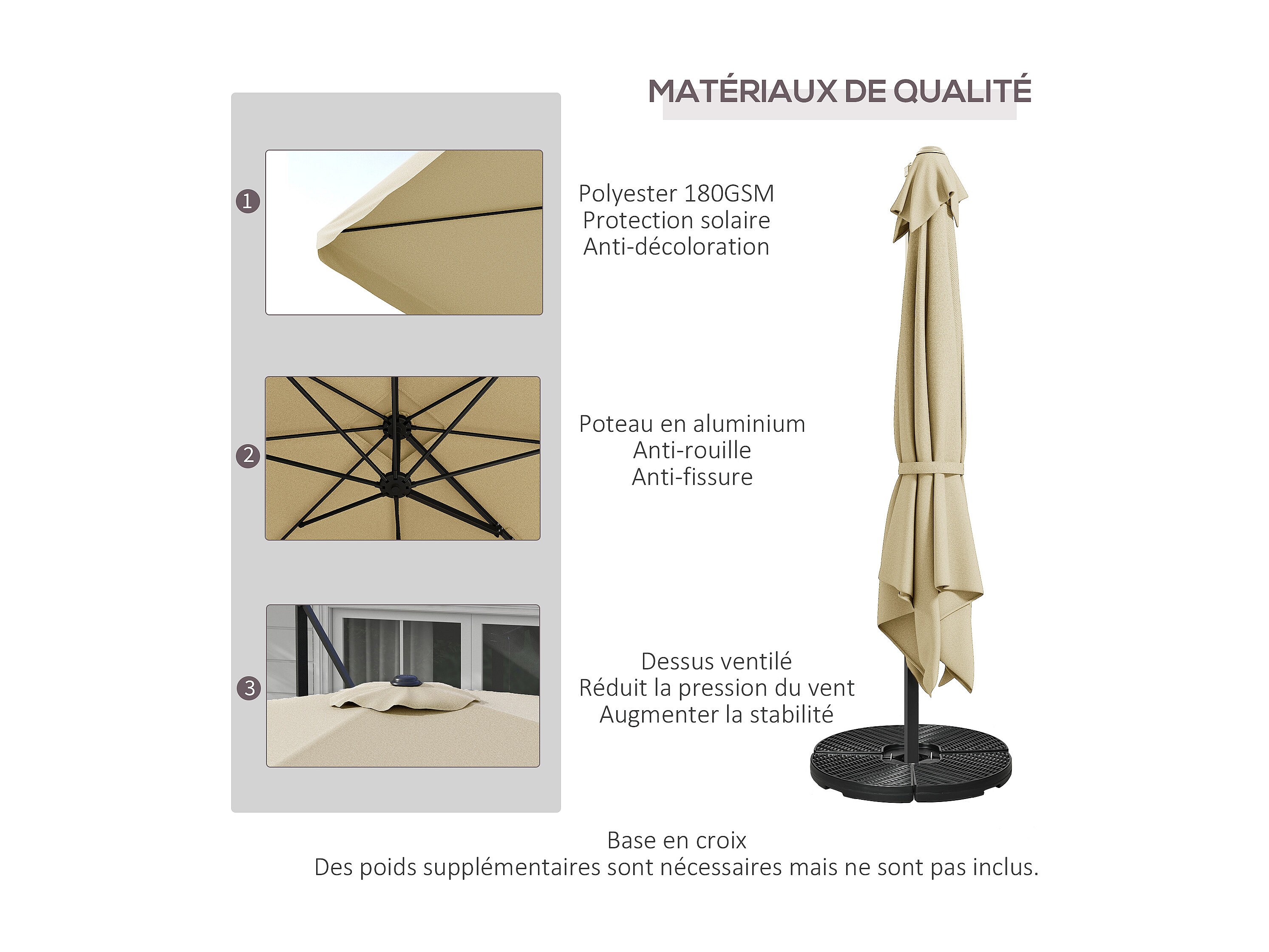 Parasol déporté rond coloris Beige Protection UV 50+ - Diamètre 300 x Hauteur 245 cm