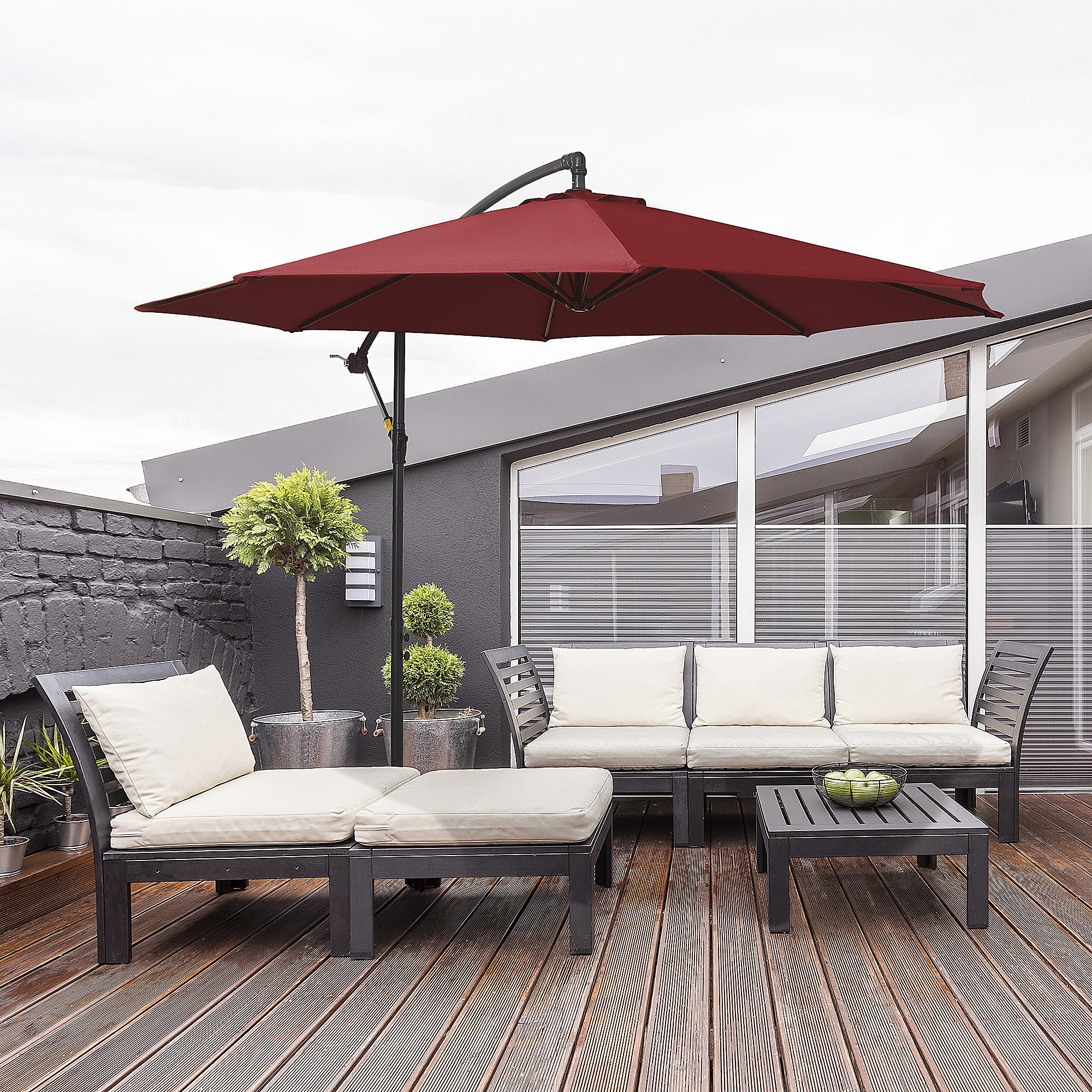 Parasol Déporté Inclinable 3x3M avec Base Croisée Rotatif à 360°,Manivelle,8 Baleines,Event pour Jardin,Terrasse,Vin-Rouge