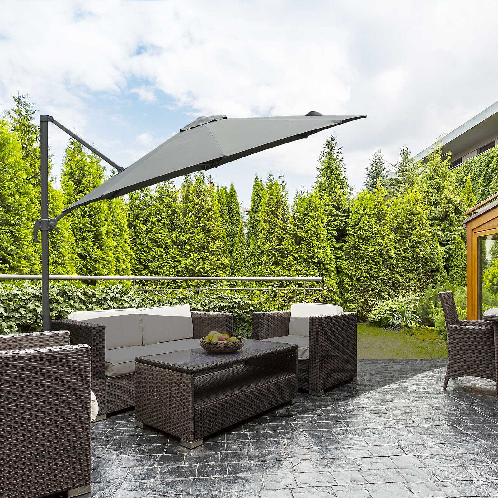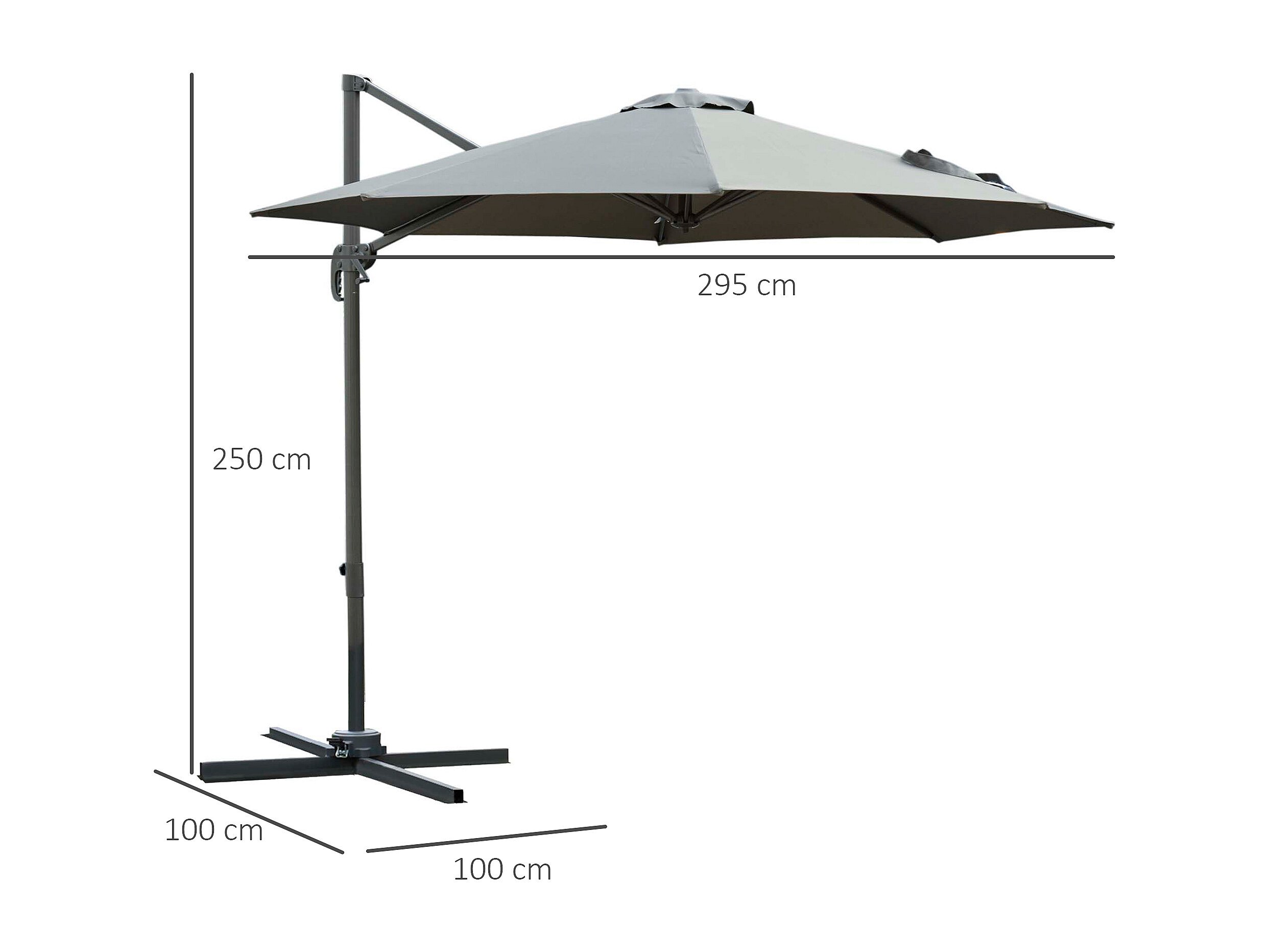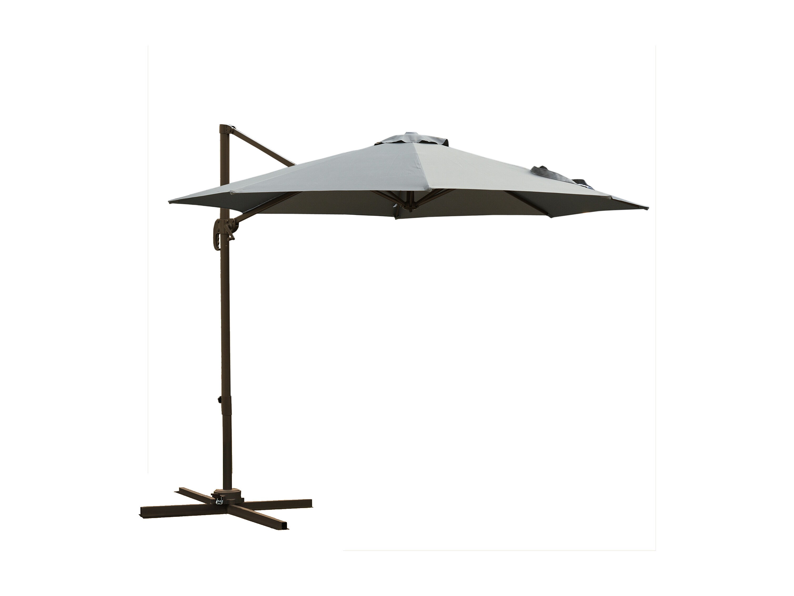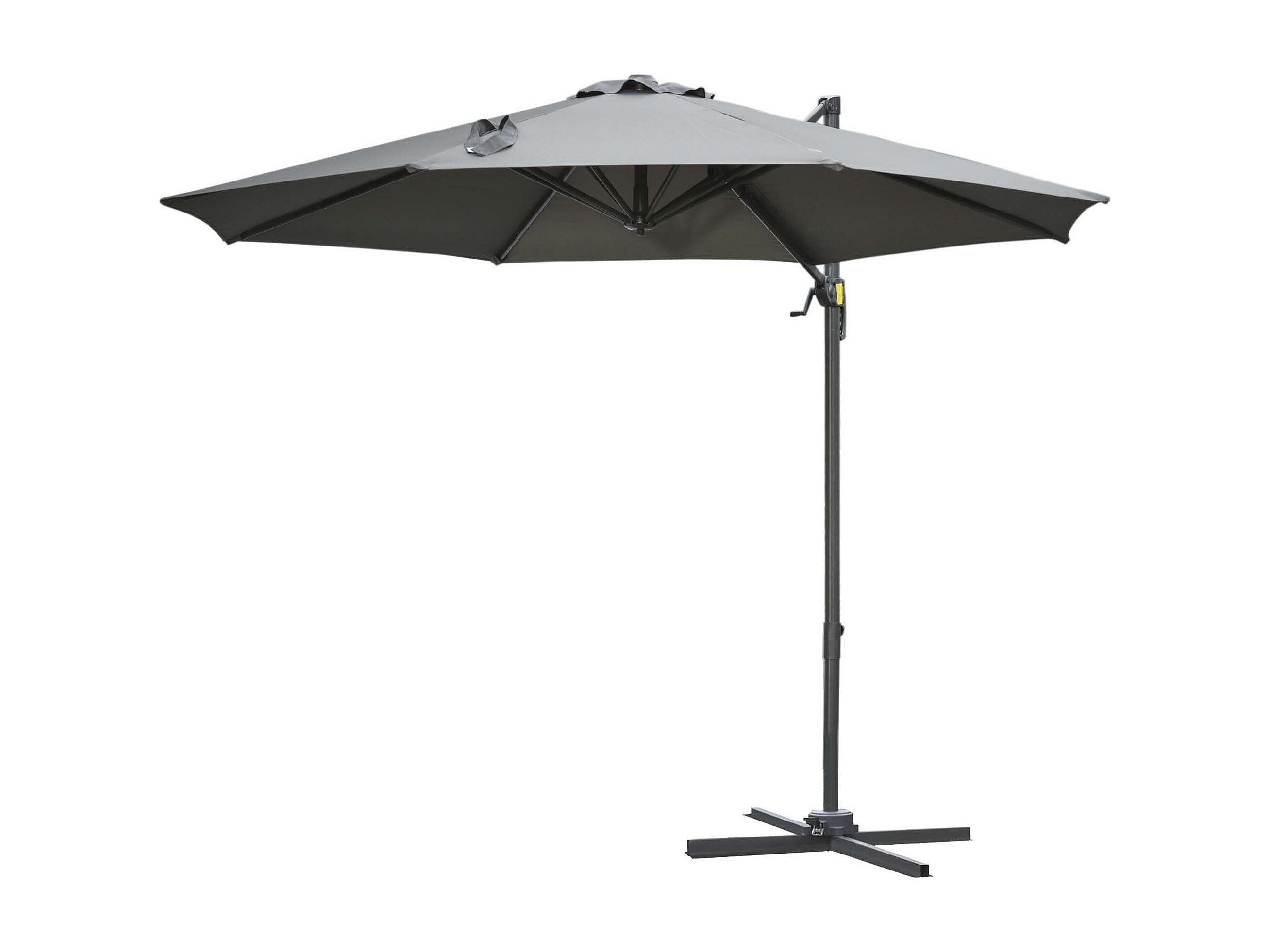 Parasol déporté octogonal inclinable rotatif 360° manivelle piètement acier mât alu. dim. Ø 2,95 x 2,5H m polyester haute densité gris