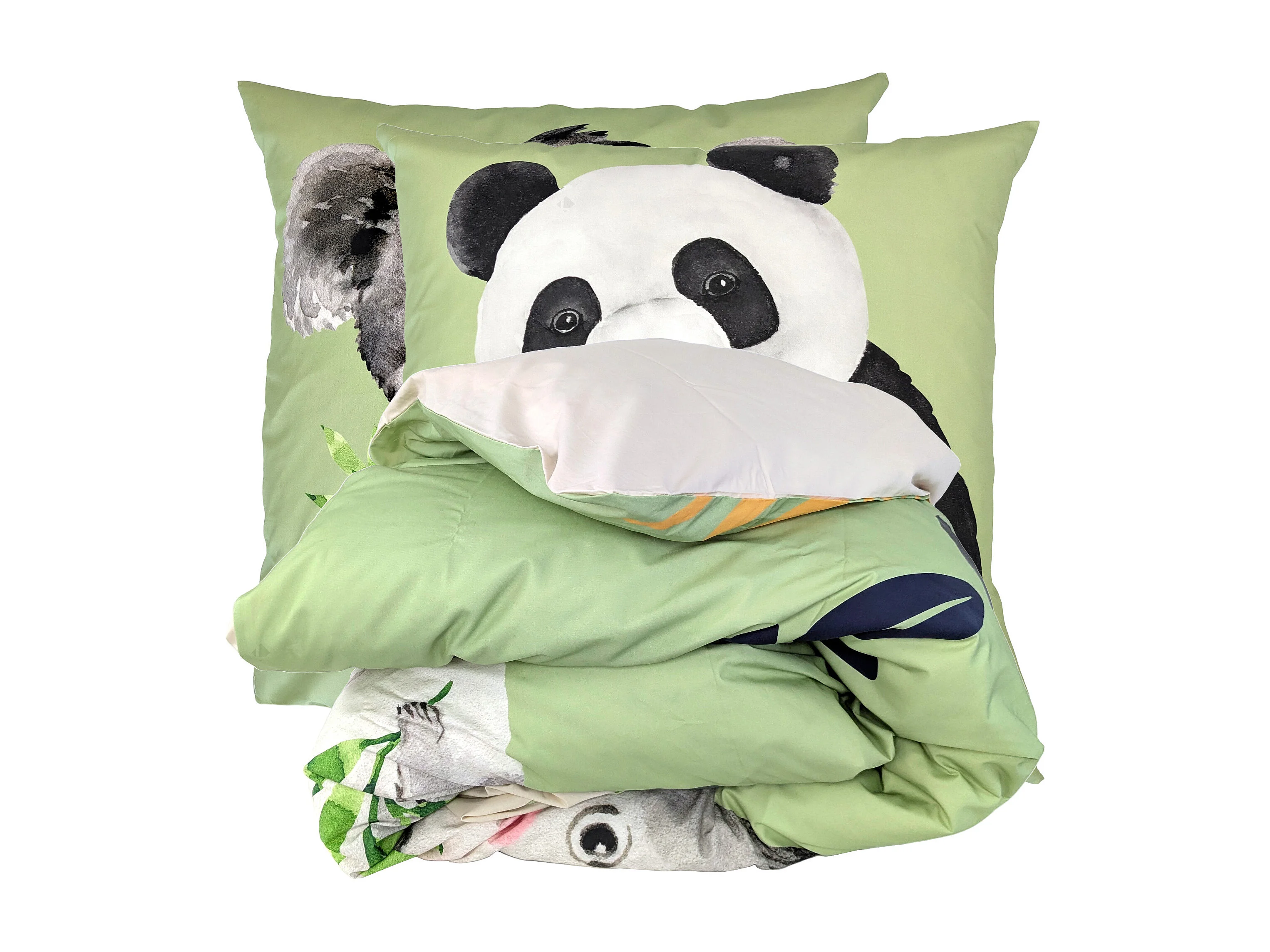 Parure de lit 200x200 cm 65x65 cm percale de coton PANDA vert 3 pièces