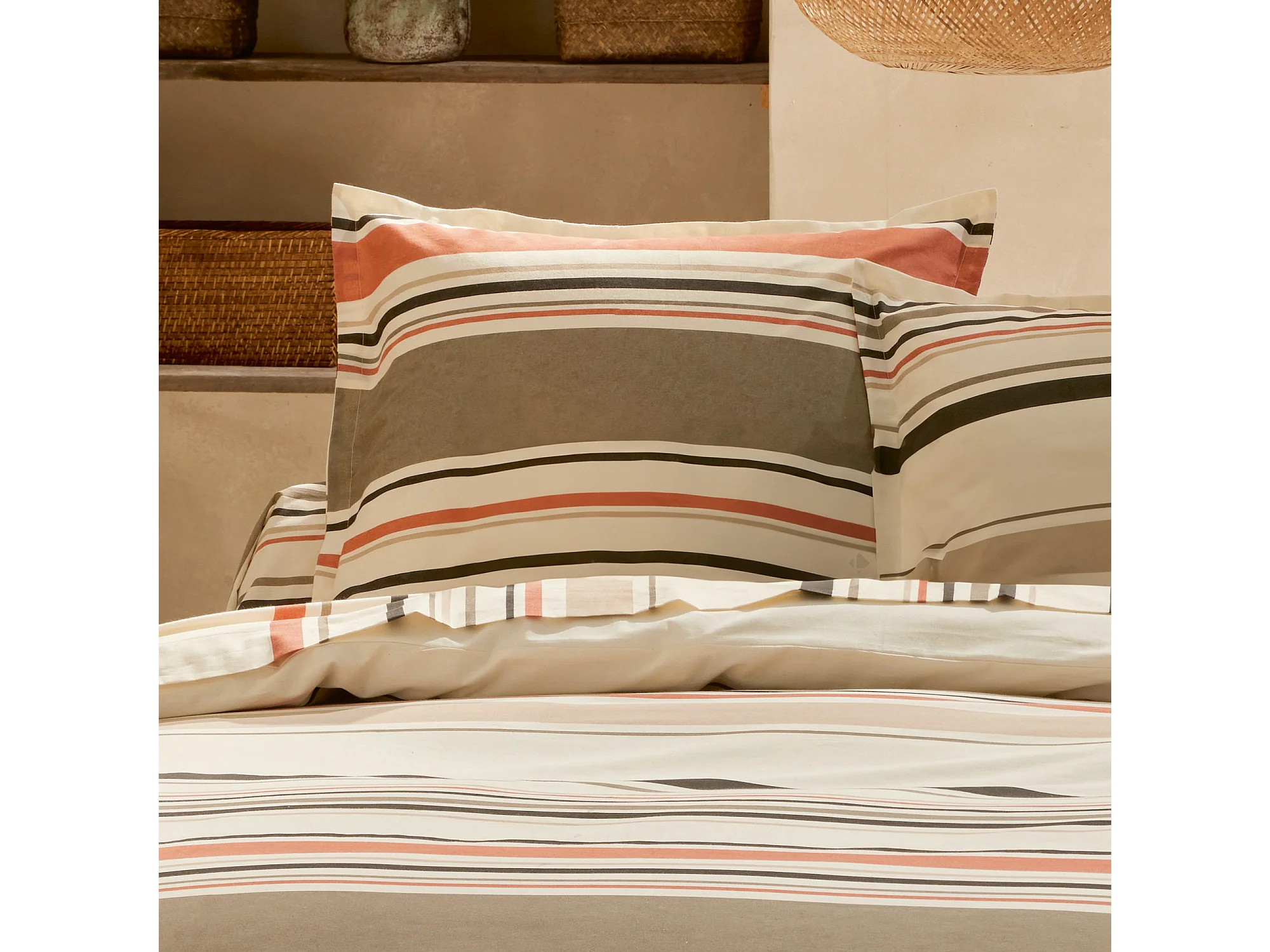 Parure de lit 3 pièces : housse 240x220 cm et taies 65x65 cm coton HUGO beige/corail