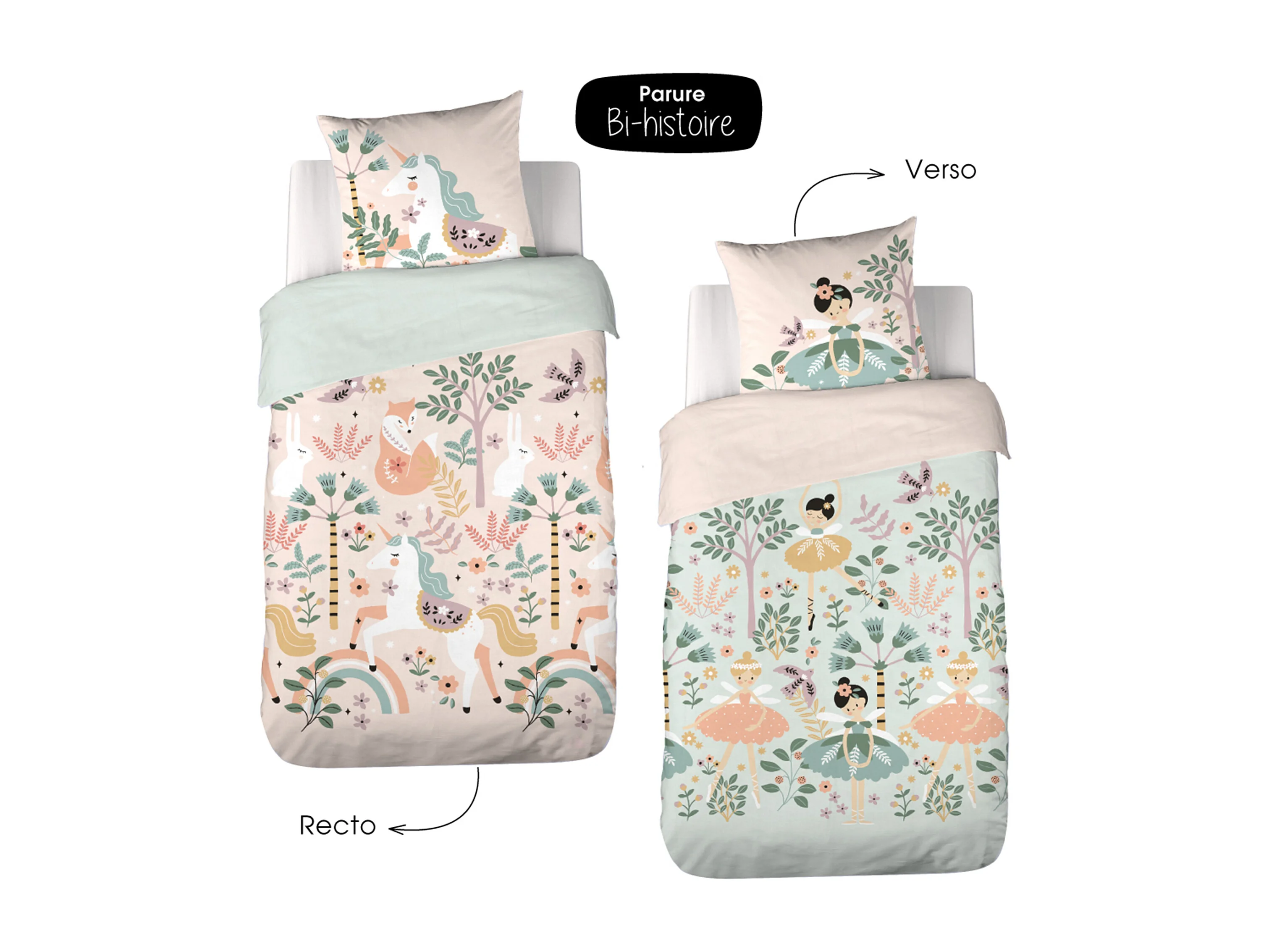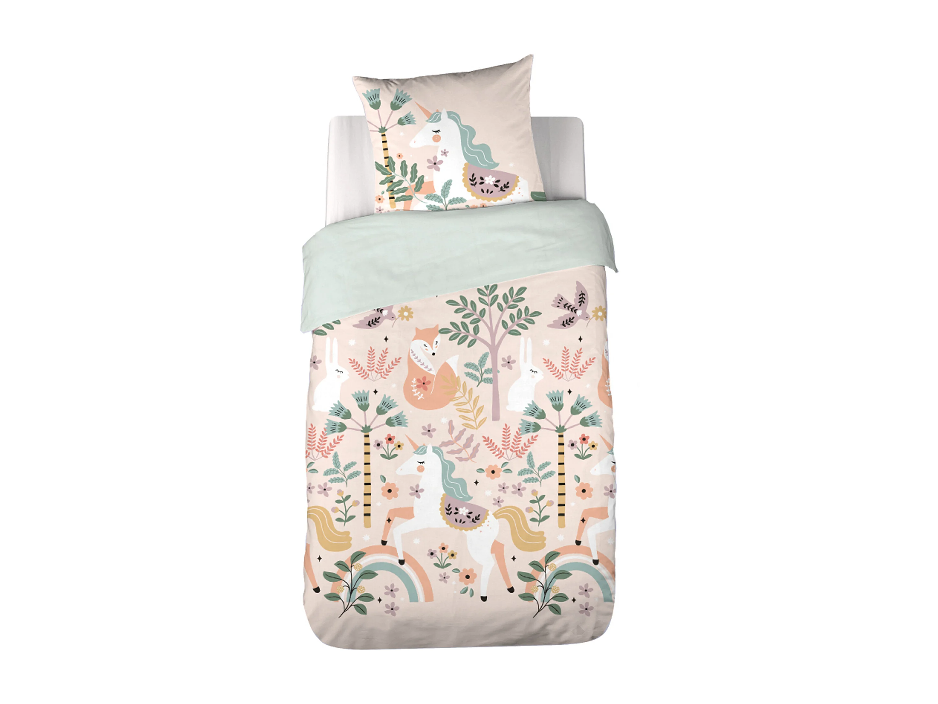 Parure de lit enfant 140x200 cm coton LA DAME A LICORNE rose 2 pièces