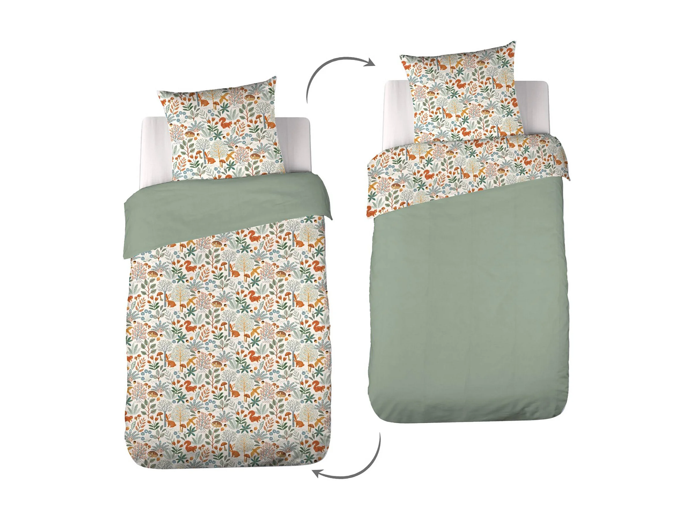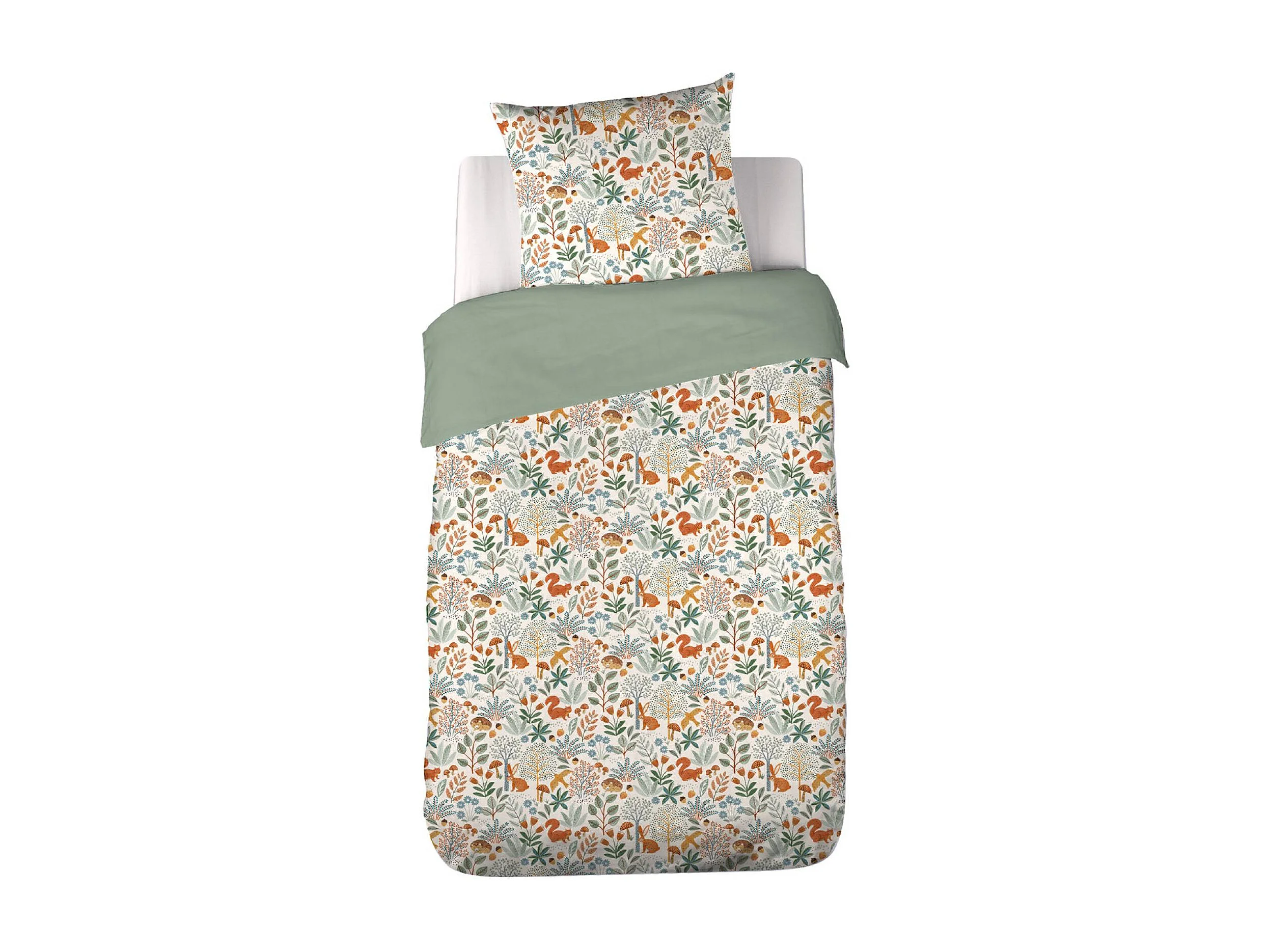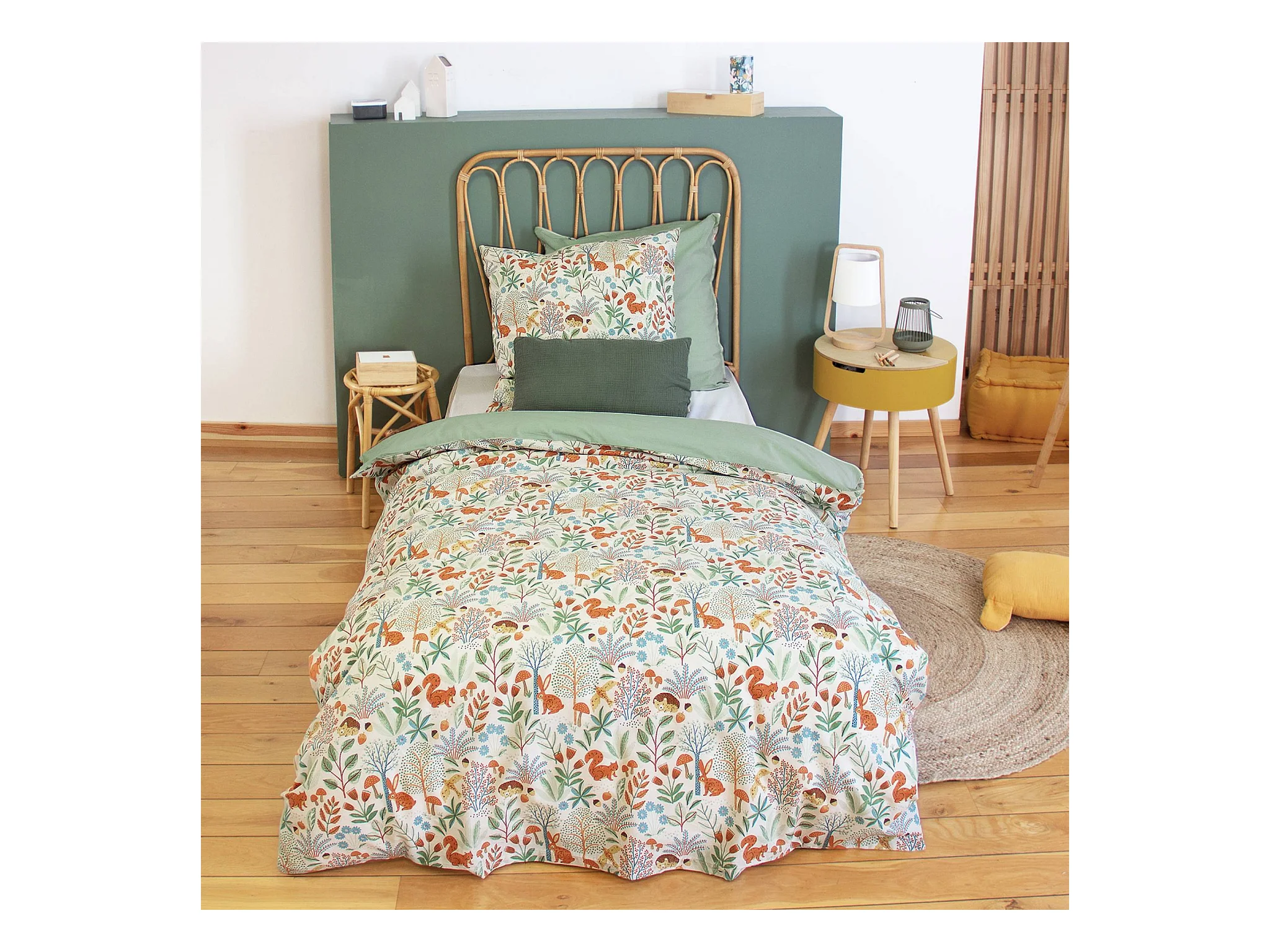 Parure de lit MAXENCE réversible 1 place imprimé thème automne. vert. 140 x 200cm