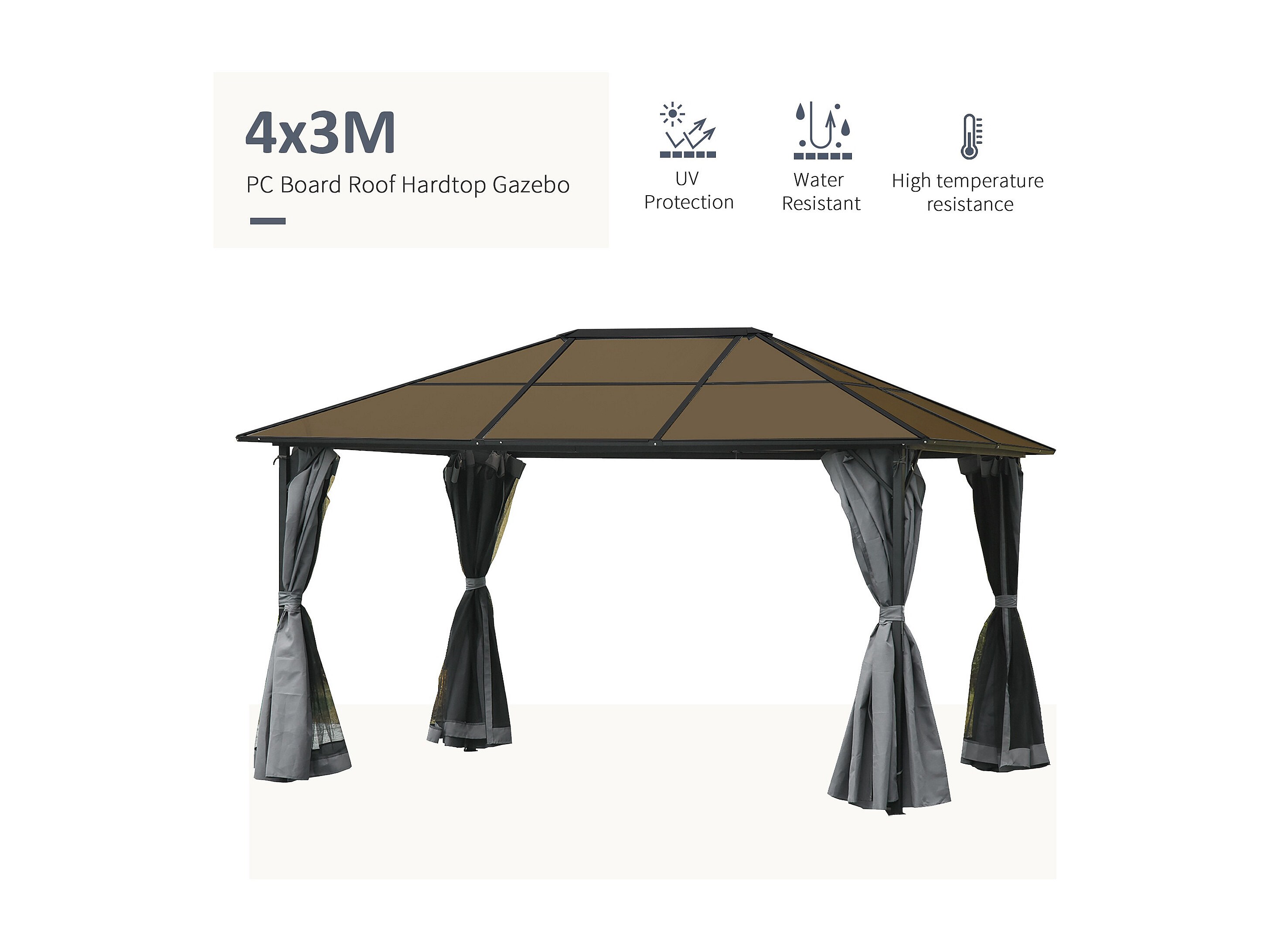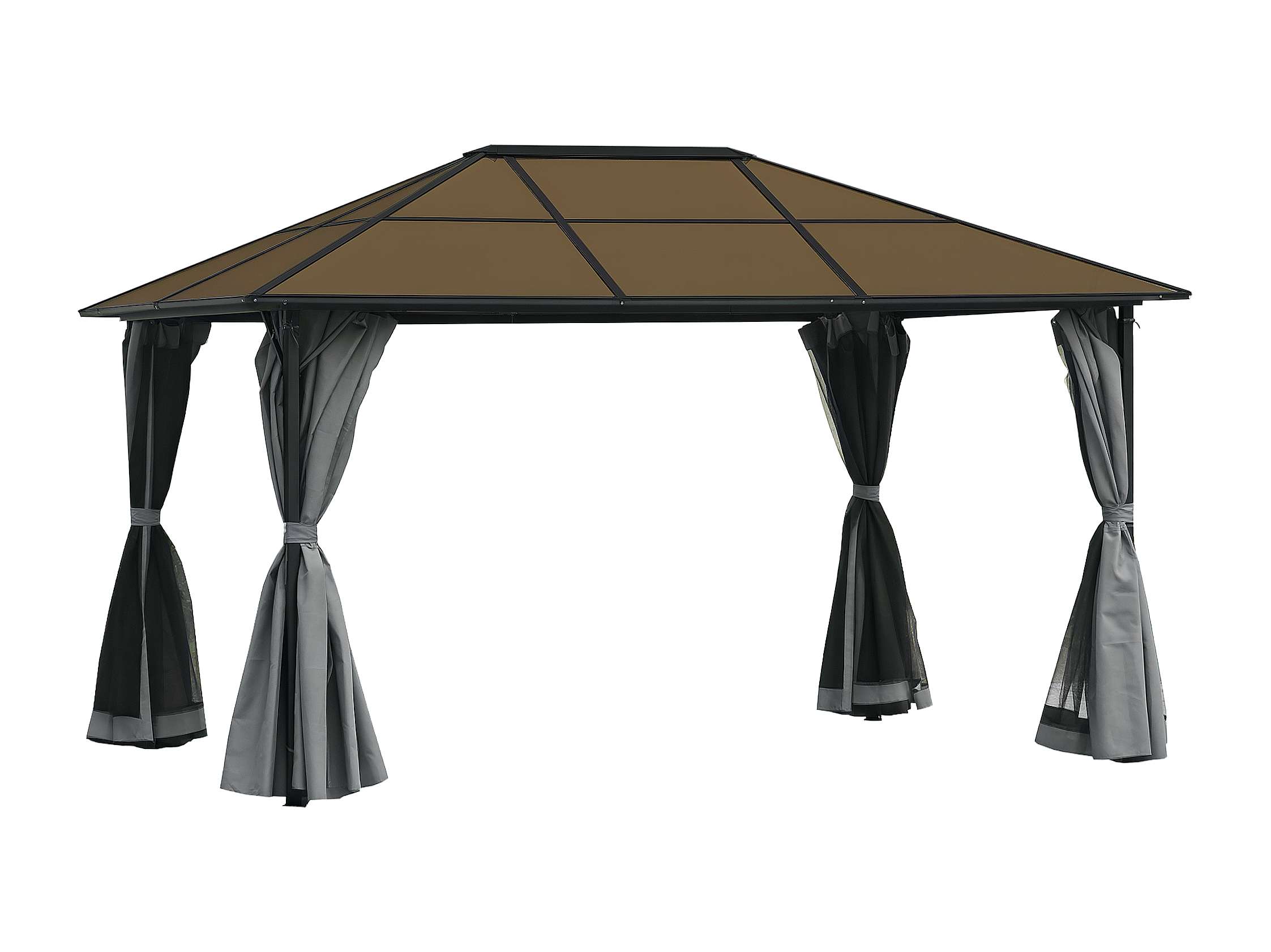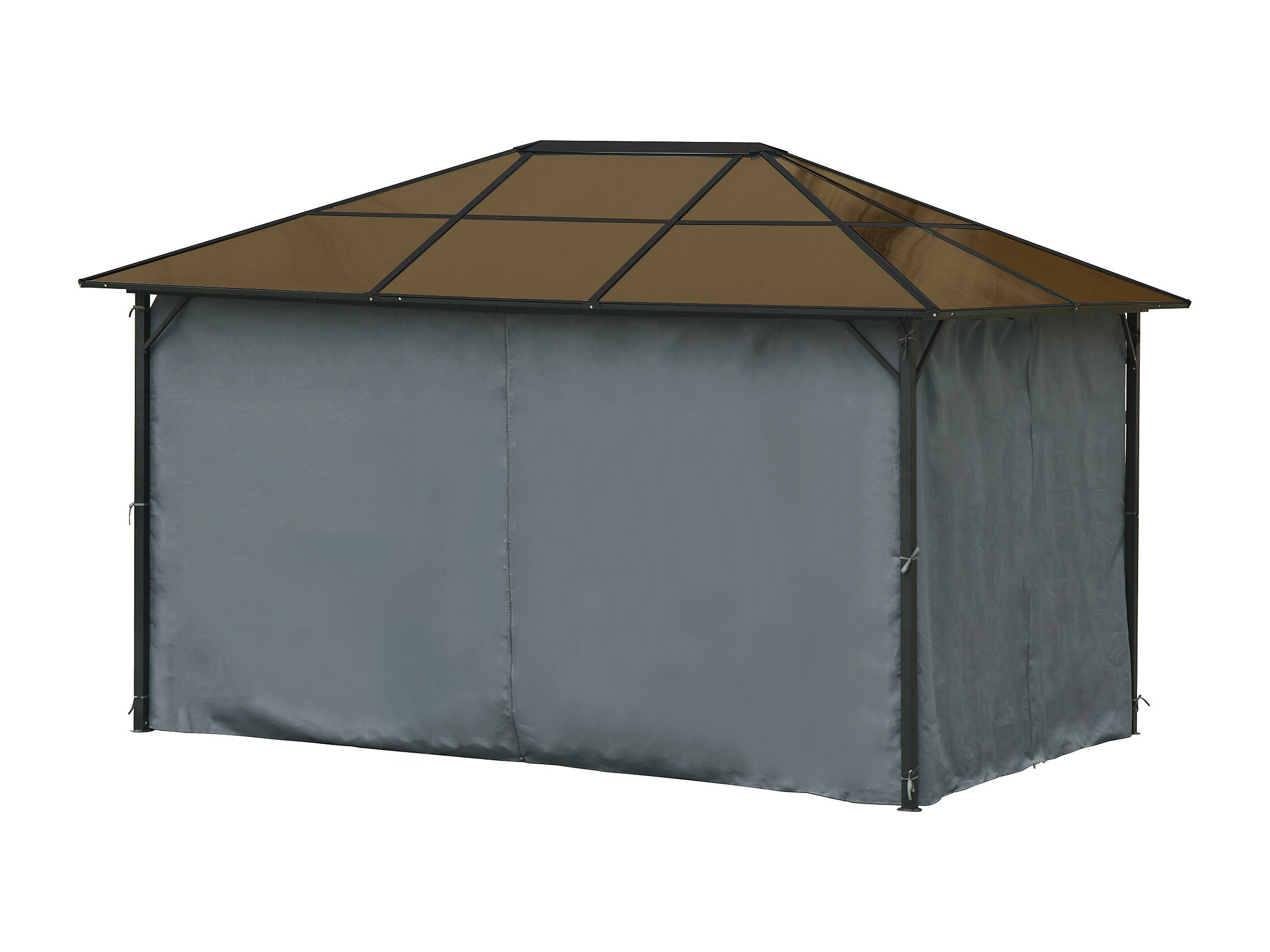 Pavillon de jardin tonnelle rigide dim. 4L x 3l x 2,65H m 4 parois latérales anti-UV gris 4 moustiquaires zippées alu. métal polycarbonate noir brun
