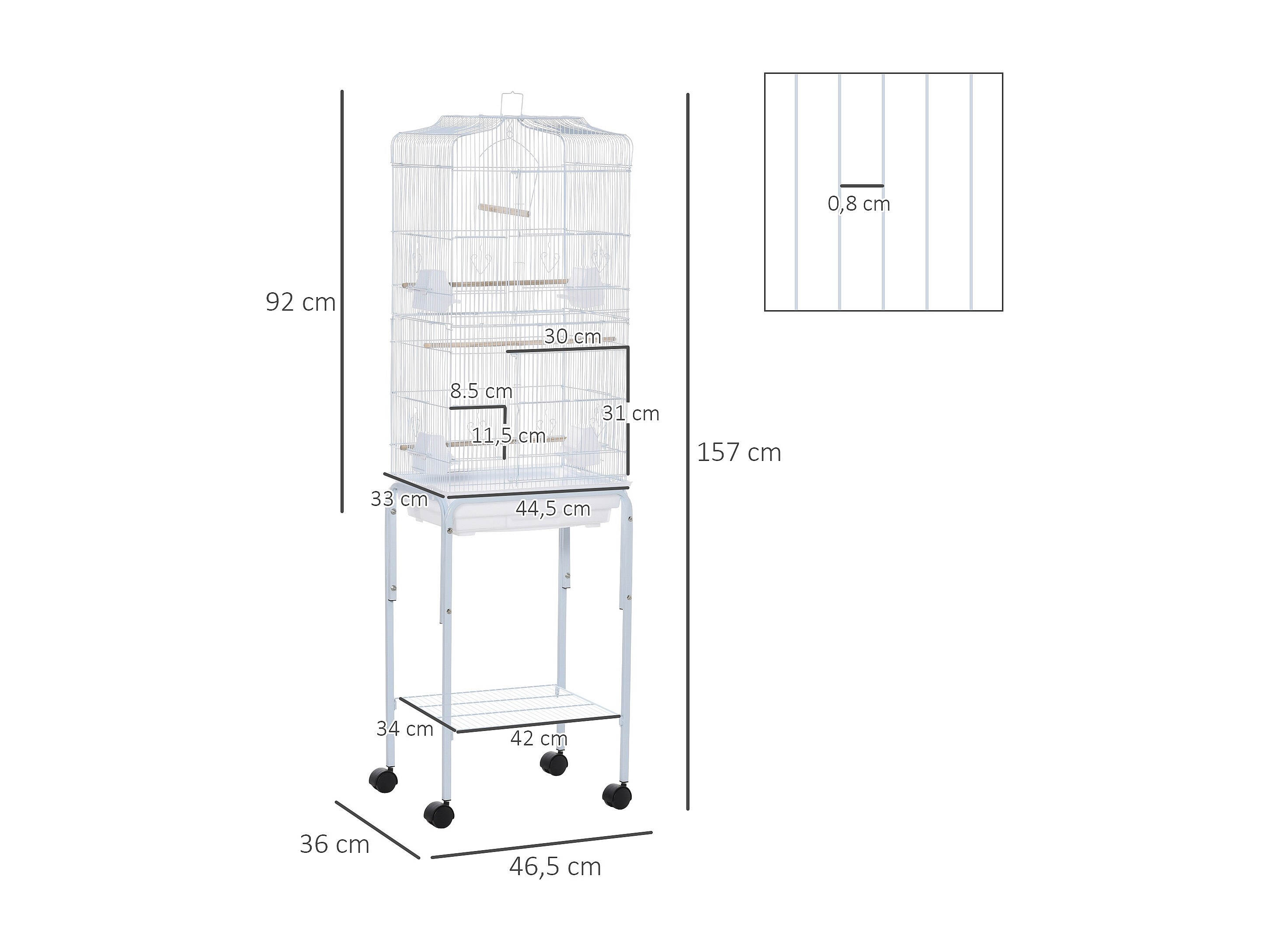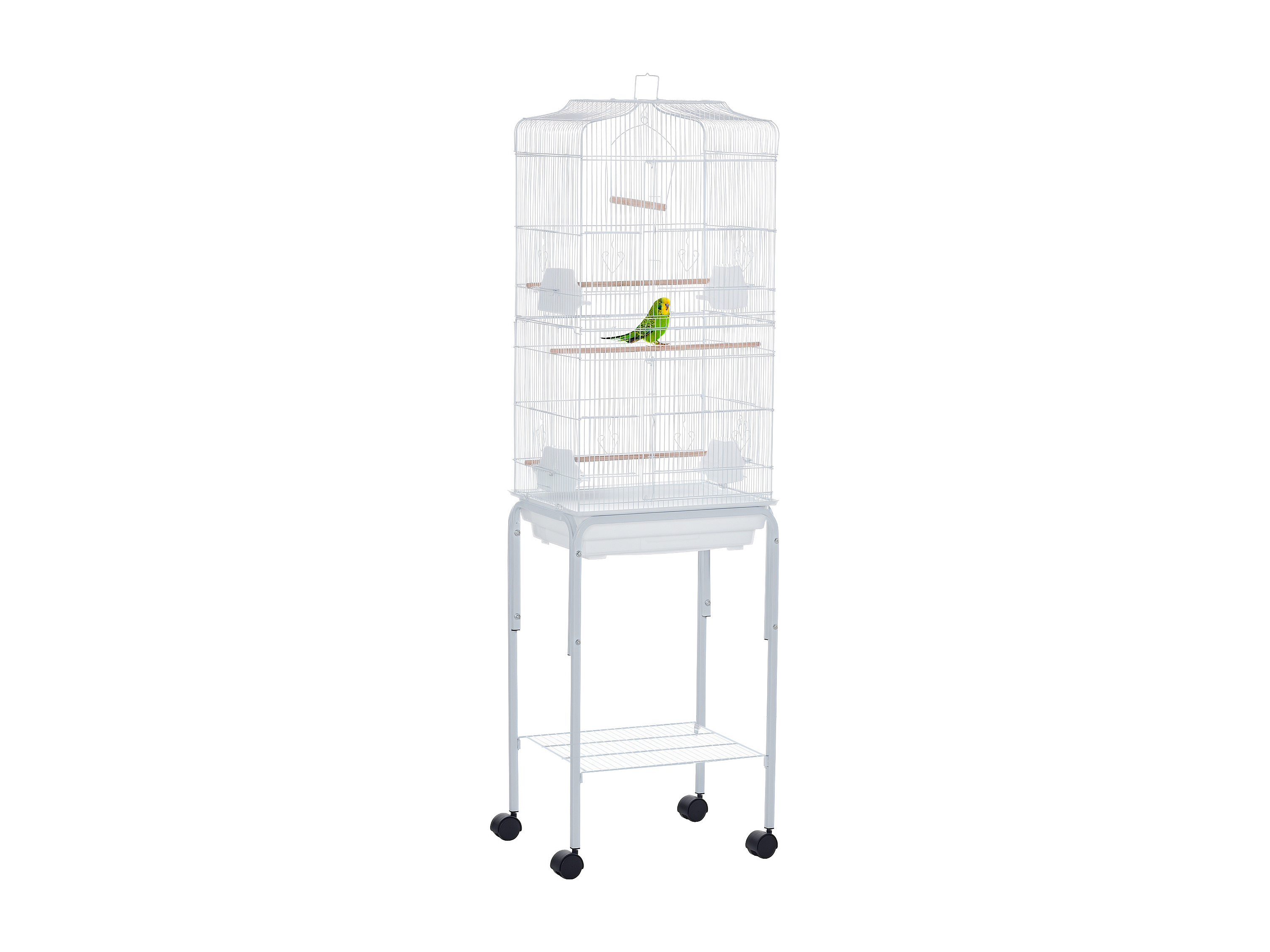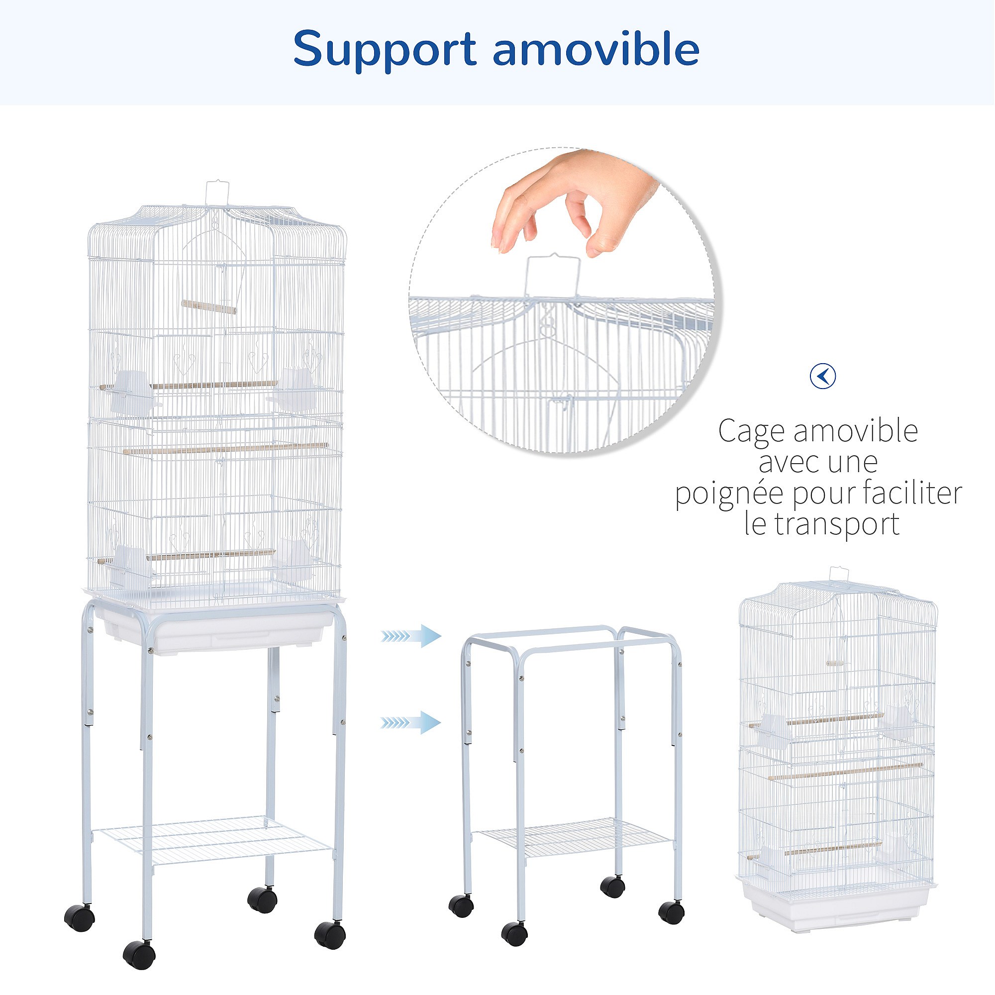PawHut Cage à oiseaux sur pied volière oiseaux sur roulettes avec toit ouvrant 3 perchoirs étagère inférieure 46,5 x 36 x 157 cm