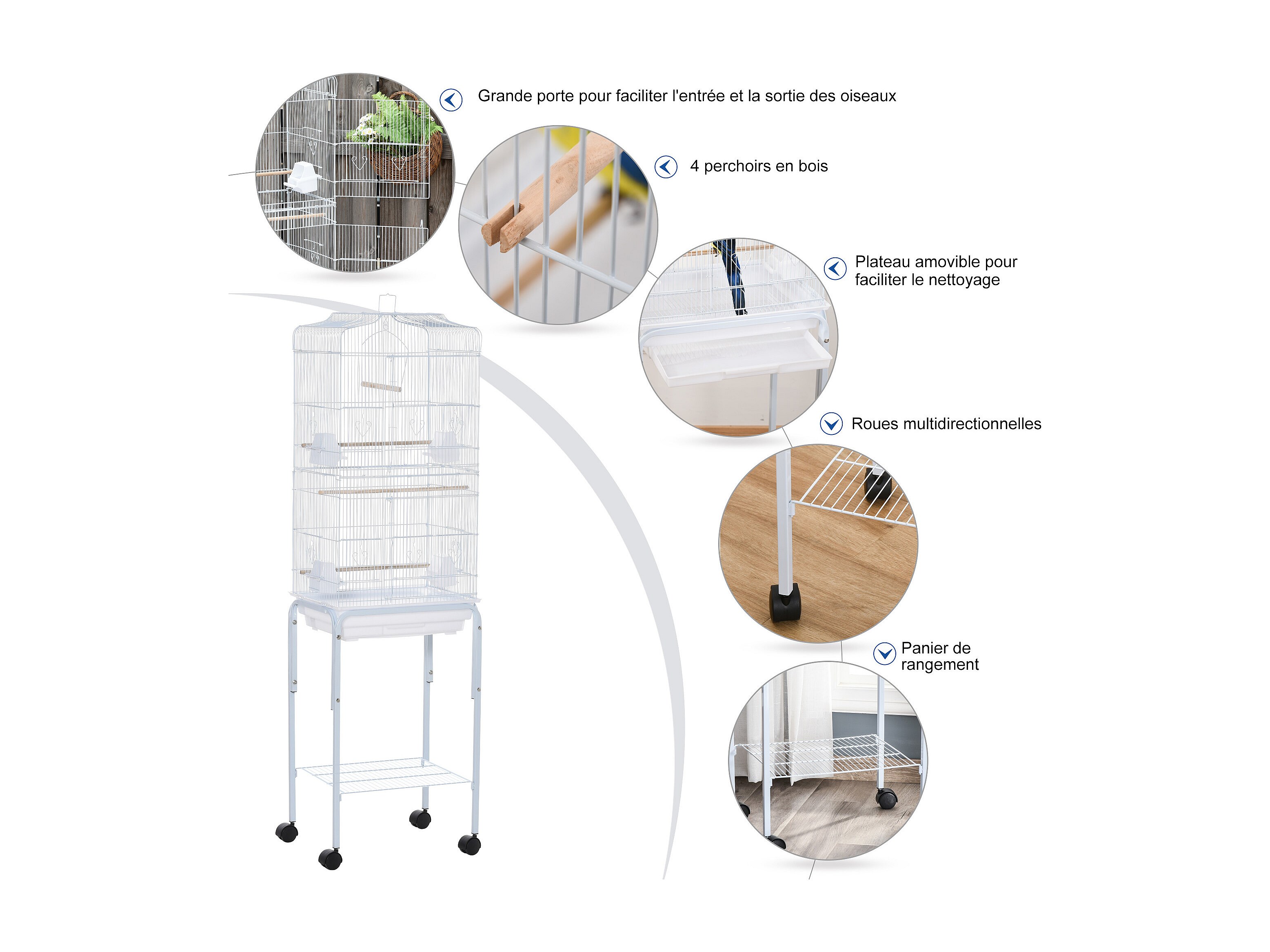 Volière cage à oiseaux sur roulettes design maison mangeoires perchoirs 10 portes plateaux excréments amovibles acier blanc