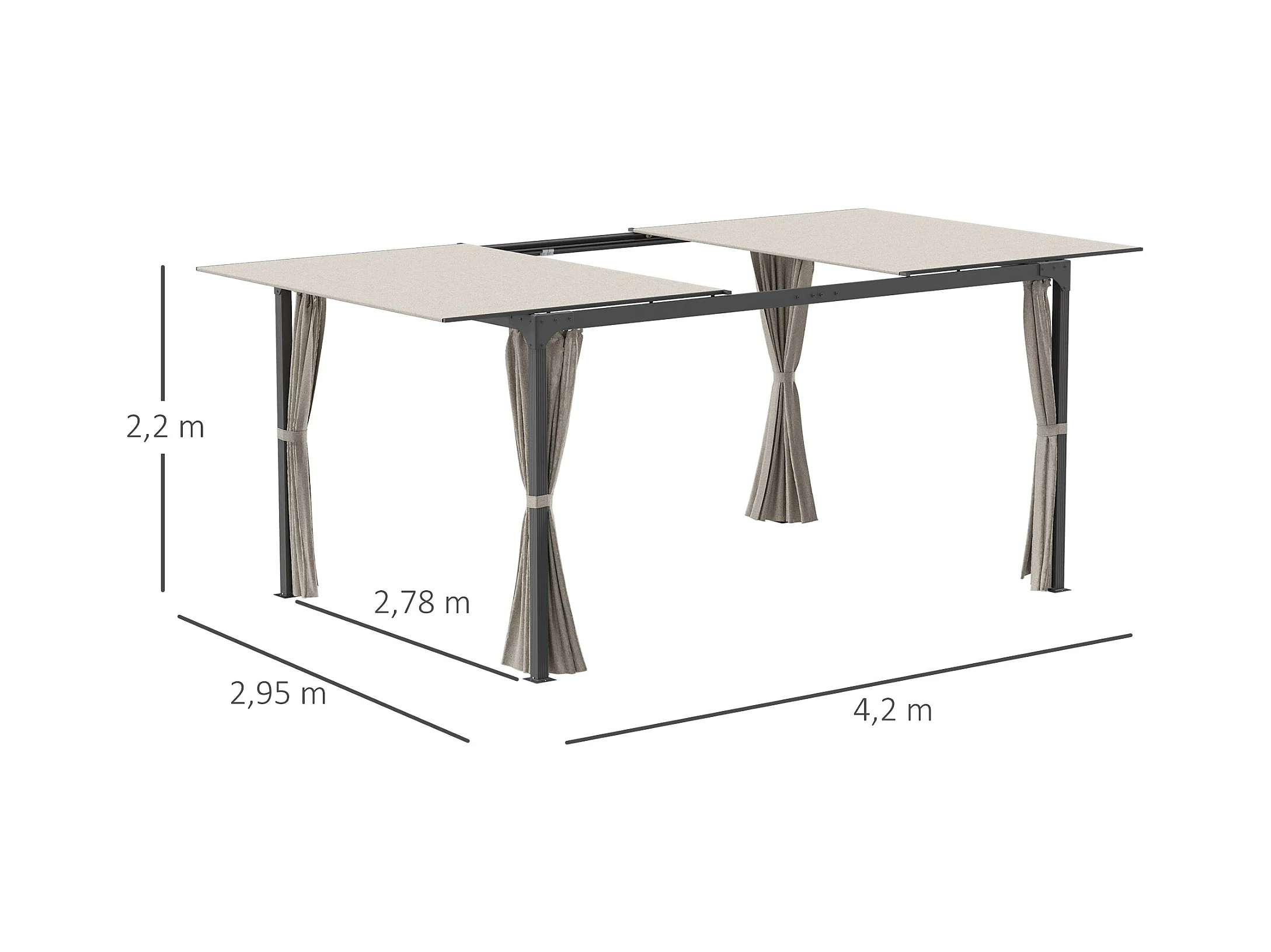 Pergola rétractable dim. 2,95L x 2,95l x 2,20H m double toit coulissant 4 rideaux alu. acier noir polyester beige
