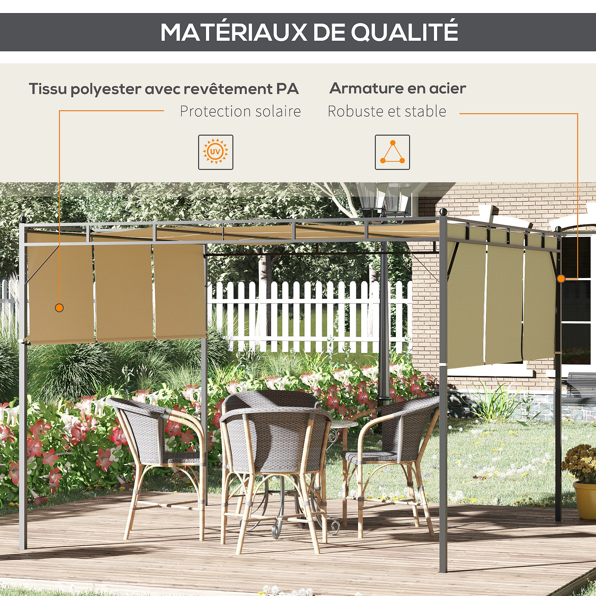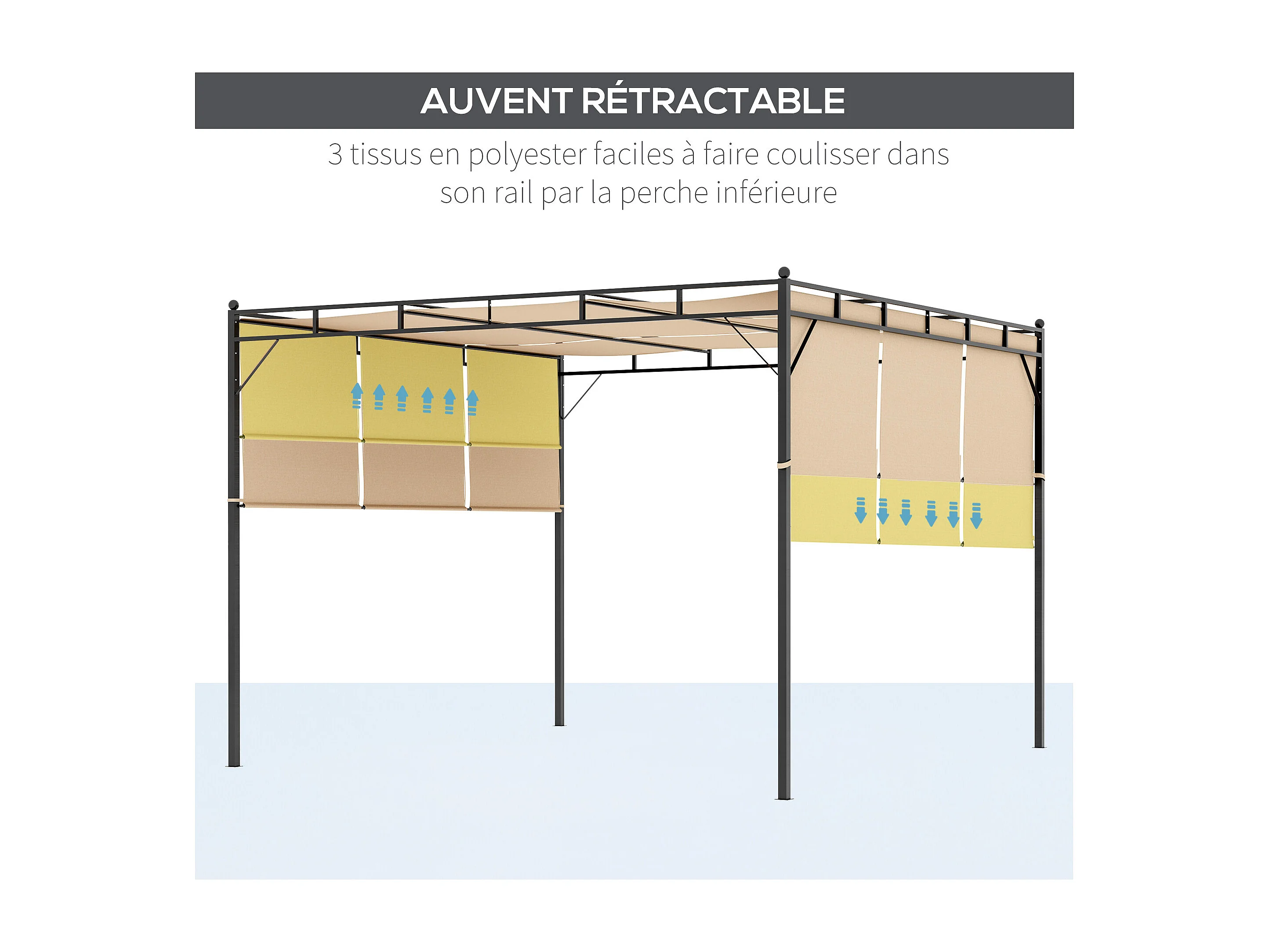 Pergola rétractable dim. 3L x 3l x 2,2H m structure acier époxy anticorrosion noir triple toile polyester haute densité beige