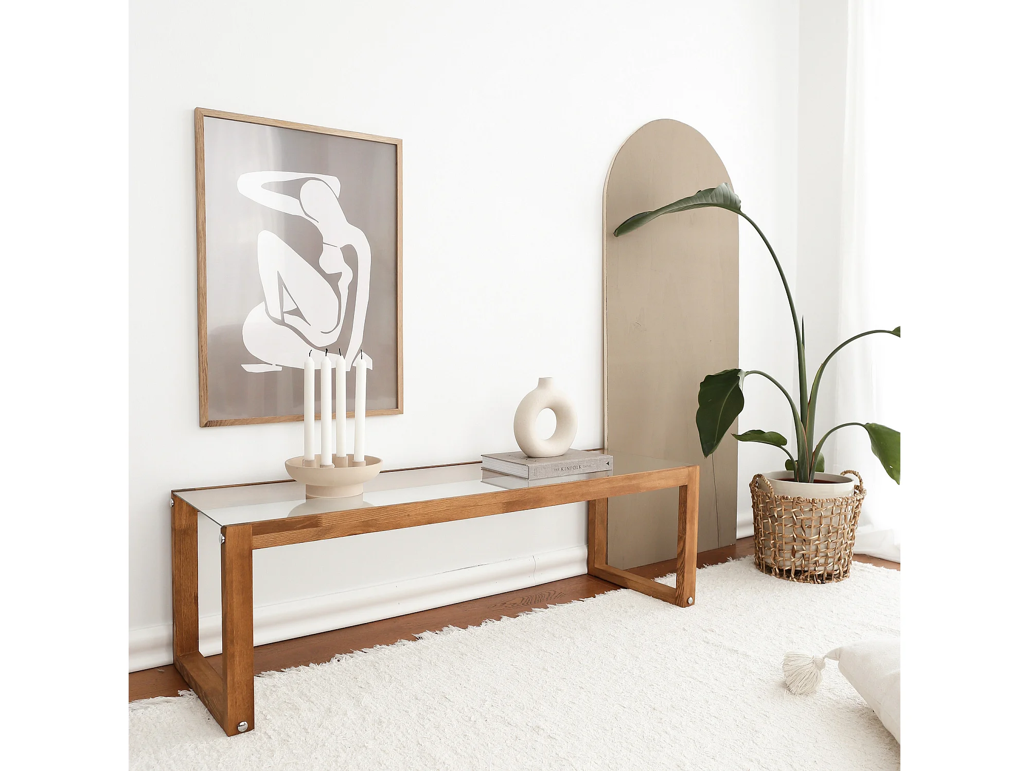 Petit meuble TV en bois massif marron et plateau en verre trempé Darone 130cm