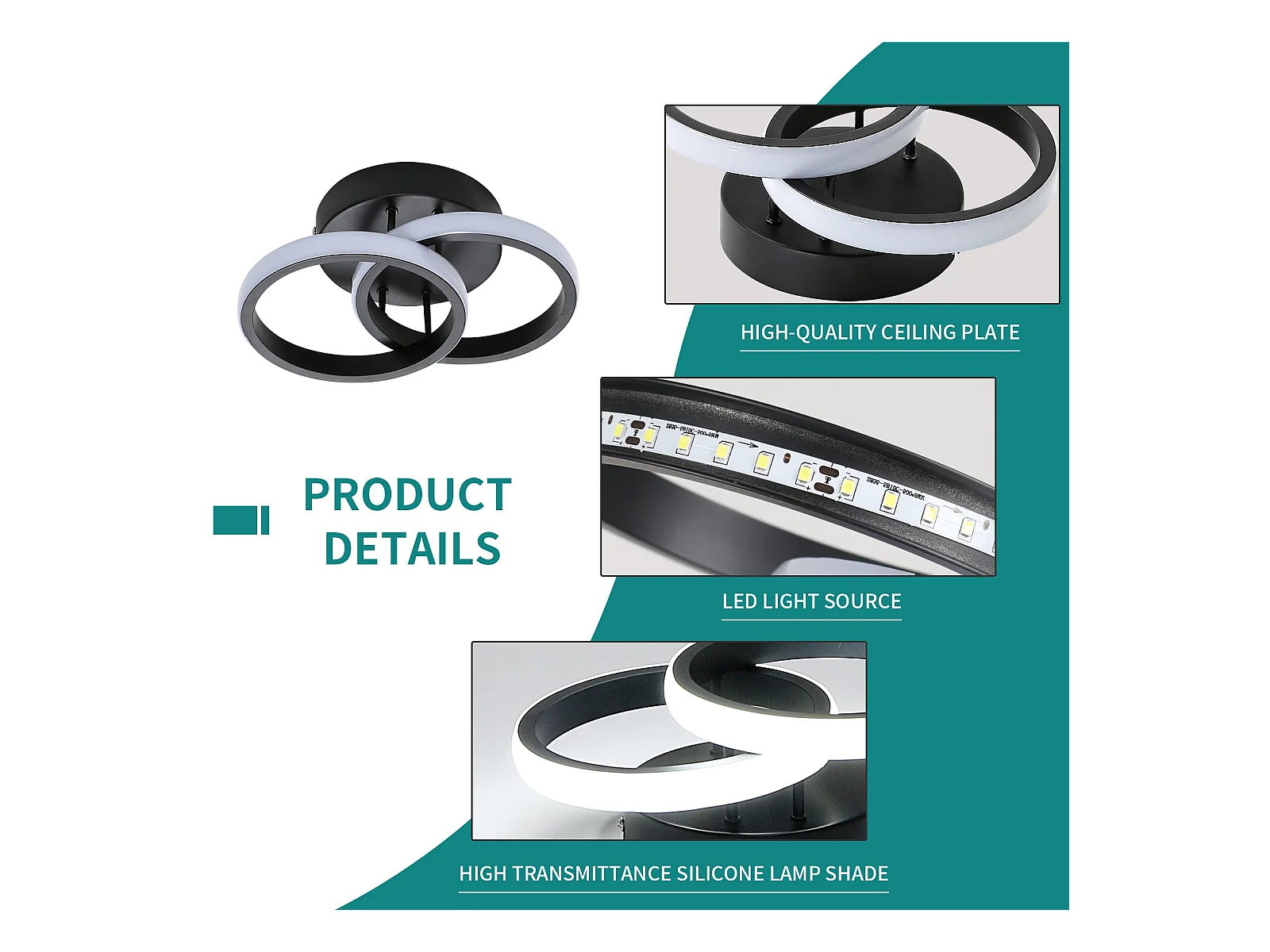 Plafonnier LED moderne double anneau, noir, 54*31*9cm, 42w, lumière blanc neutre