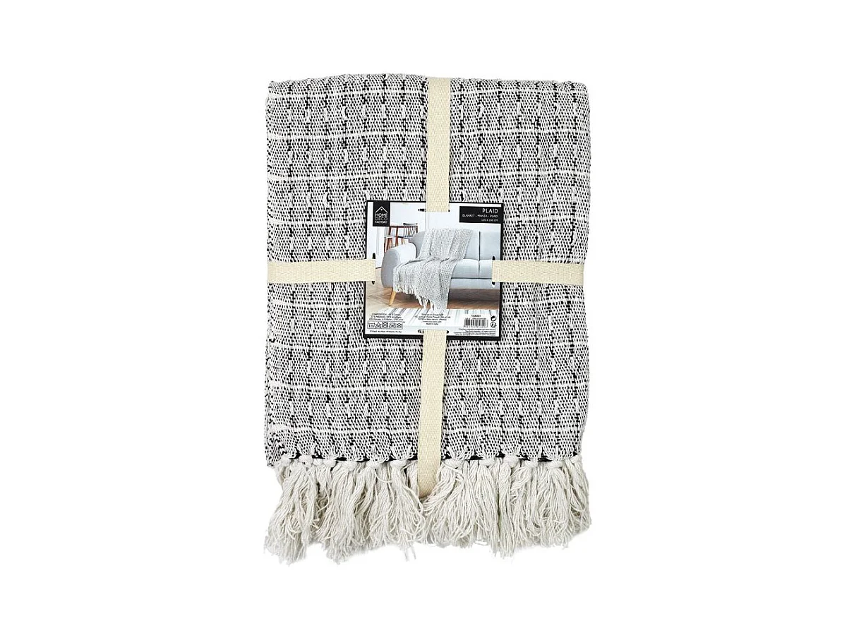 Now's Home - Plaid En Coton Tisse Main Mouchete Beige Noir Franges 125x150 Sherpa