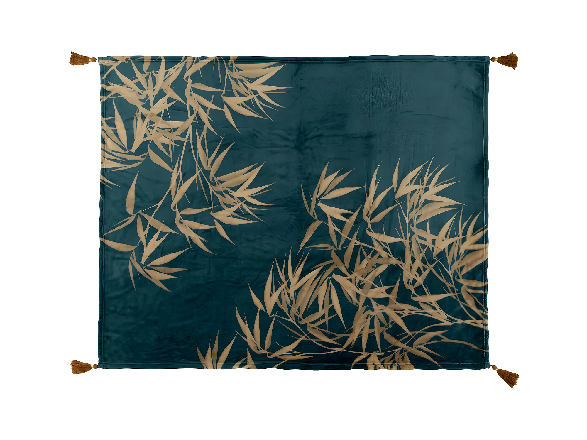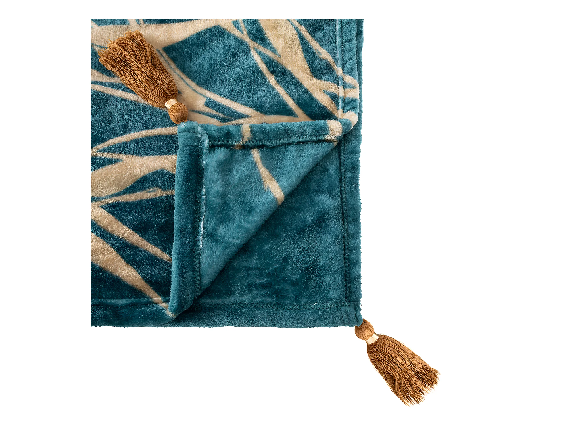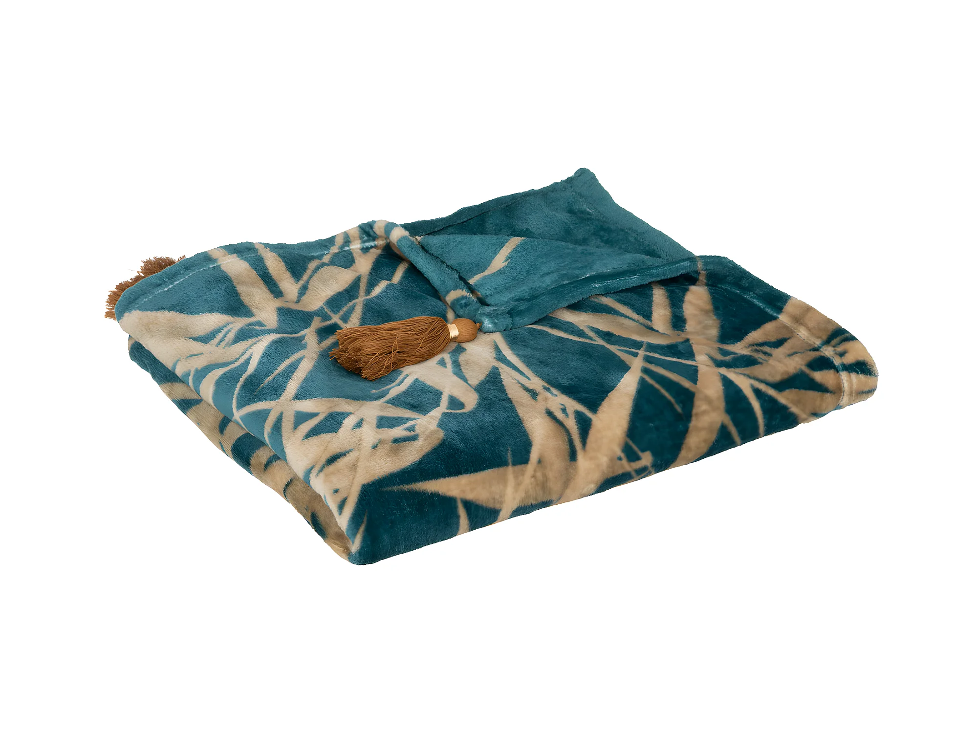 Plaid Flanelle Bleu motif Camel avec Pompons 125 x 150 cm