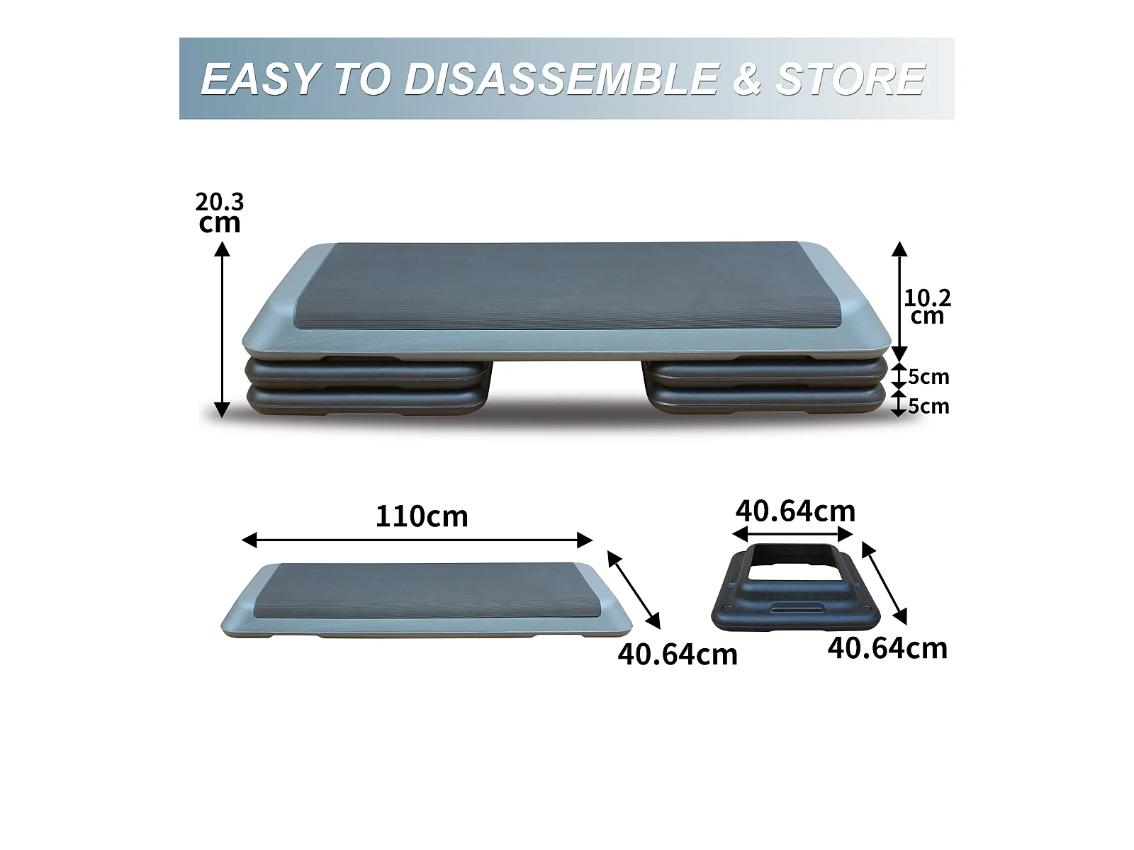 Plateforme de step aérobic réglable, surface antidérapante, polyéthylène, gris, avec 4 rehausseurs (109x41x11 cm)