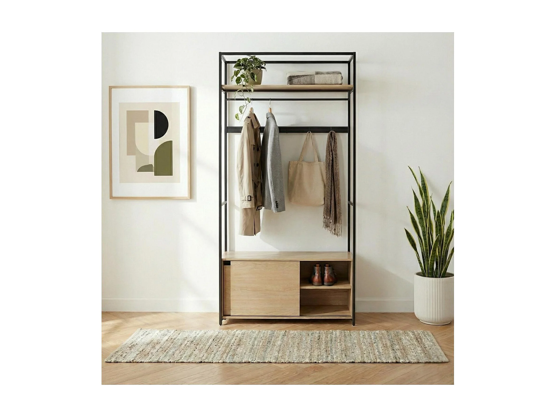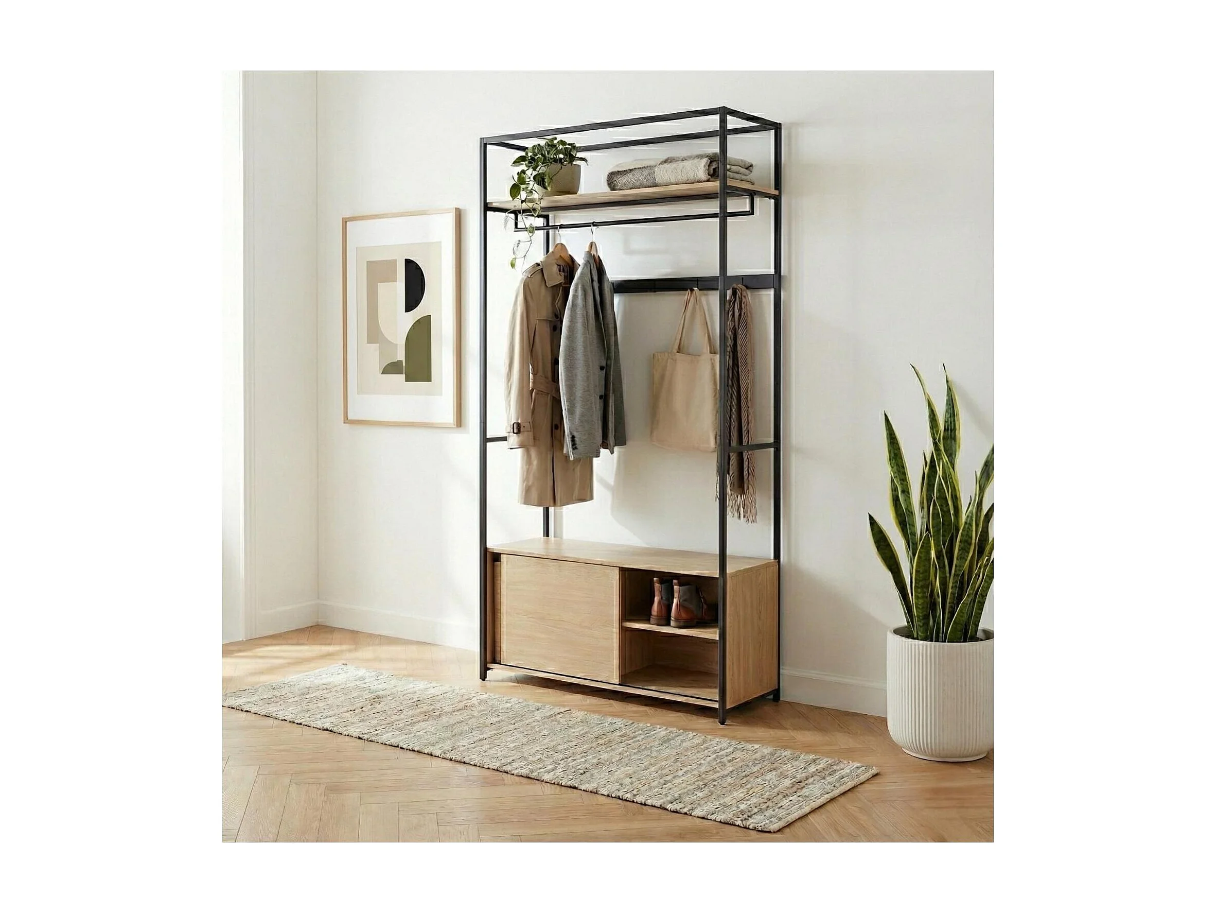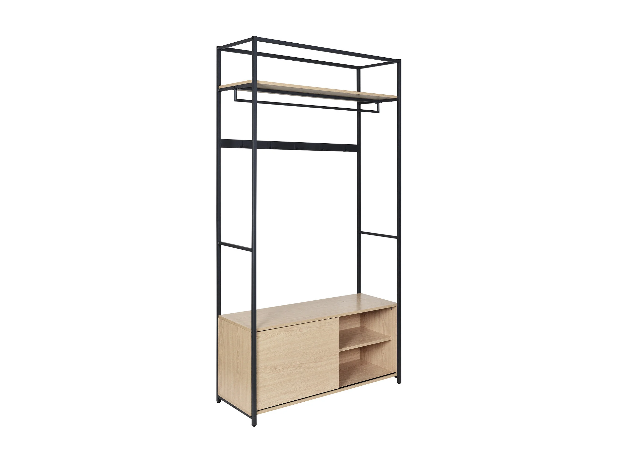 Portant d'entrée en bois et métal noir 110x200cm - rangement fermé et patères