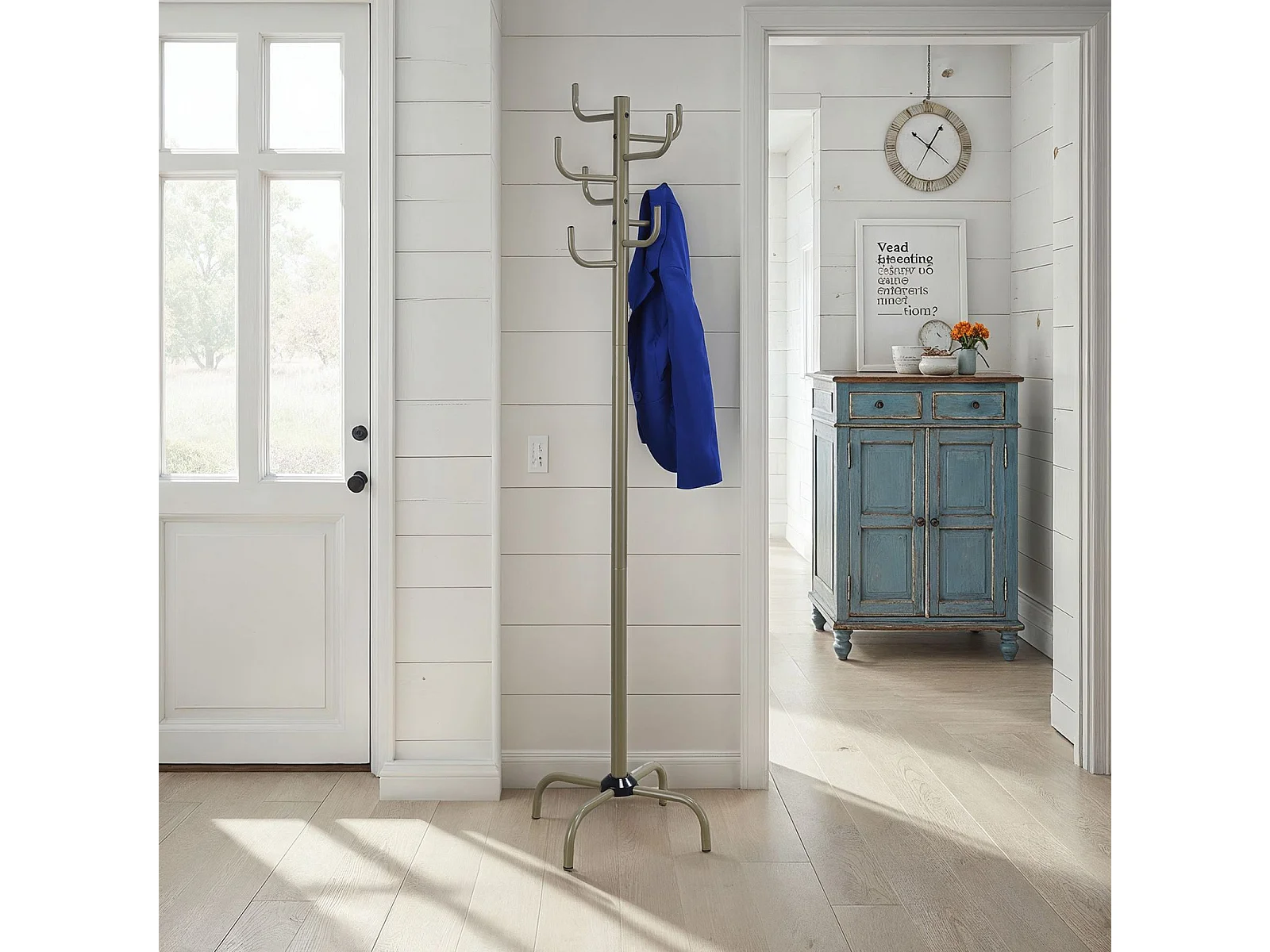 Portemanteau ZENO en métal coloris beige portant à vêtements sur pied en forme d'arbre avec 6 crochets sur différentes hauteurs