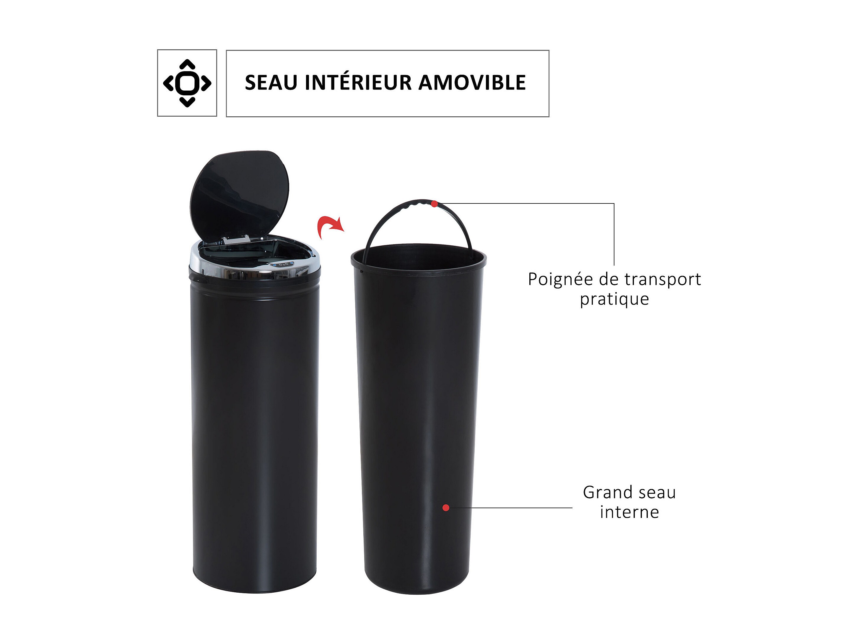 Poubelle automatique détecteur de mouvement 50L bac amovible acier inox. noir