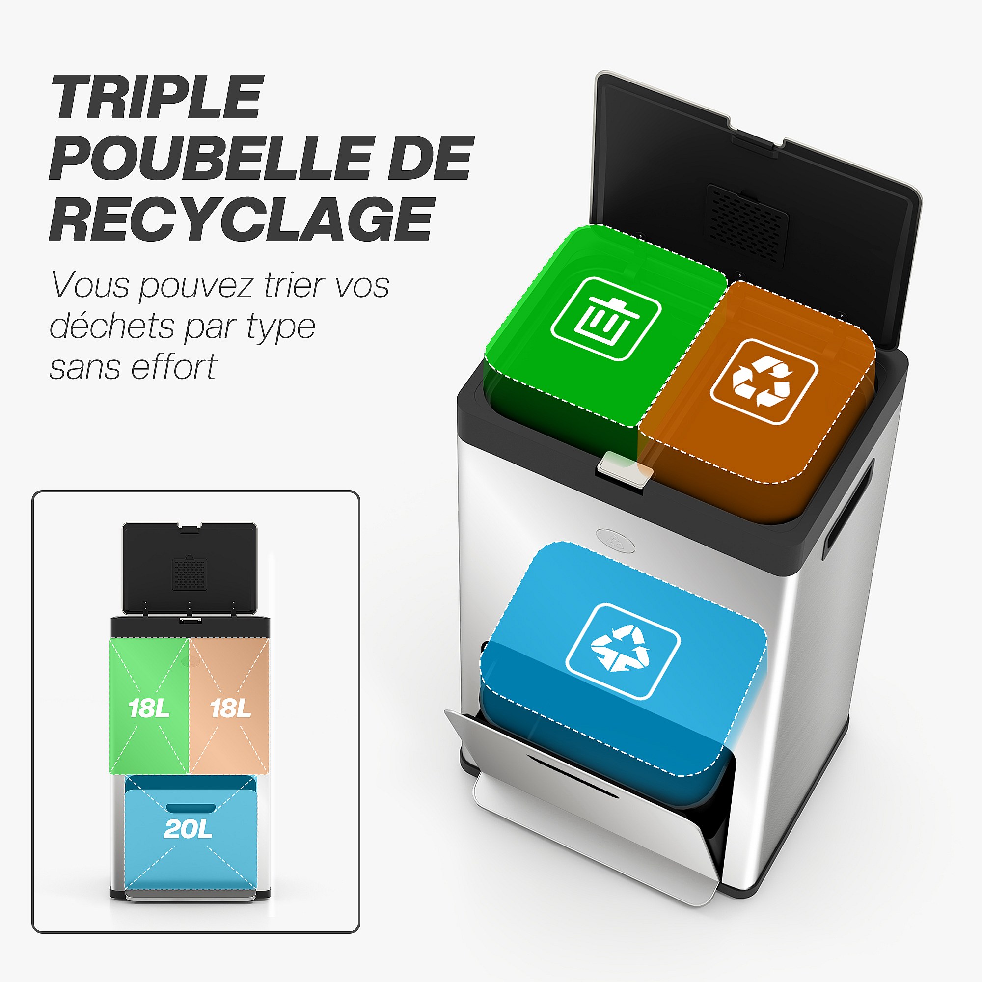 Poubelle de cuisine 2 x 18L + 20L - poubelle à pédale 3 compartiments seaux amovibles filtre anti-odeur - acier inox. brossé