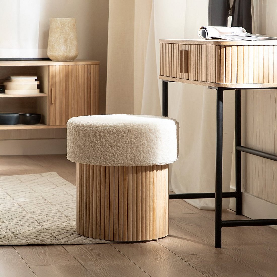 Pouf rond en bois et bouclette blanc D60 - PAVEL