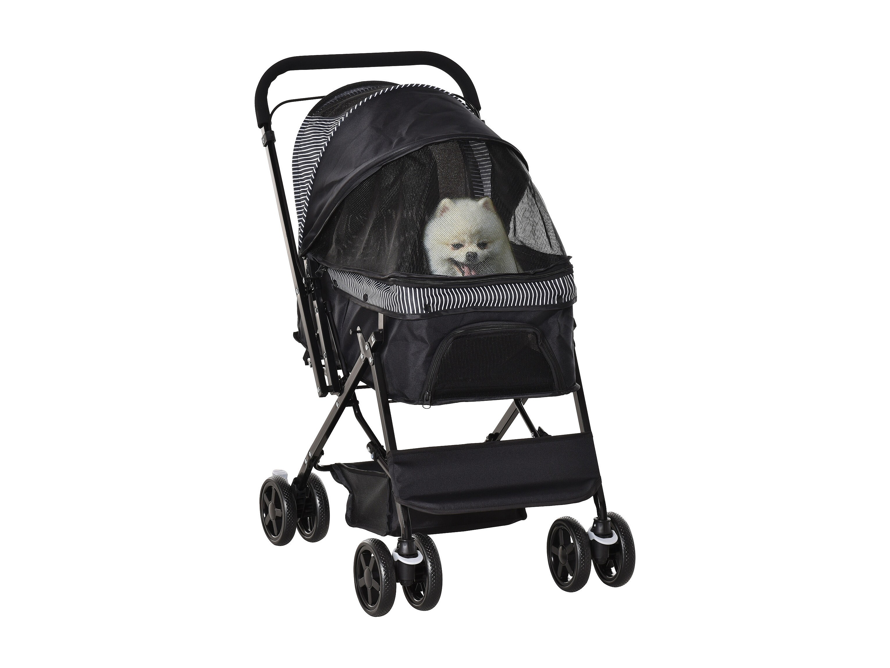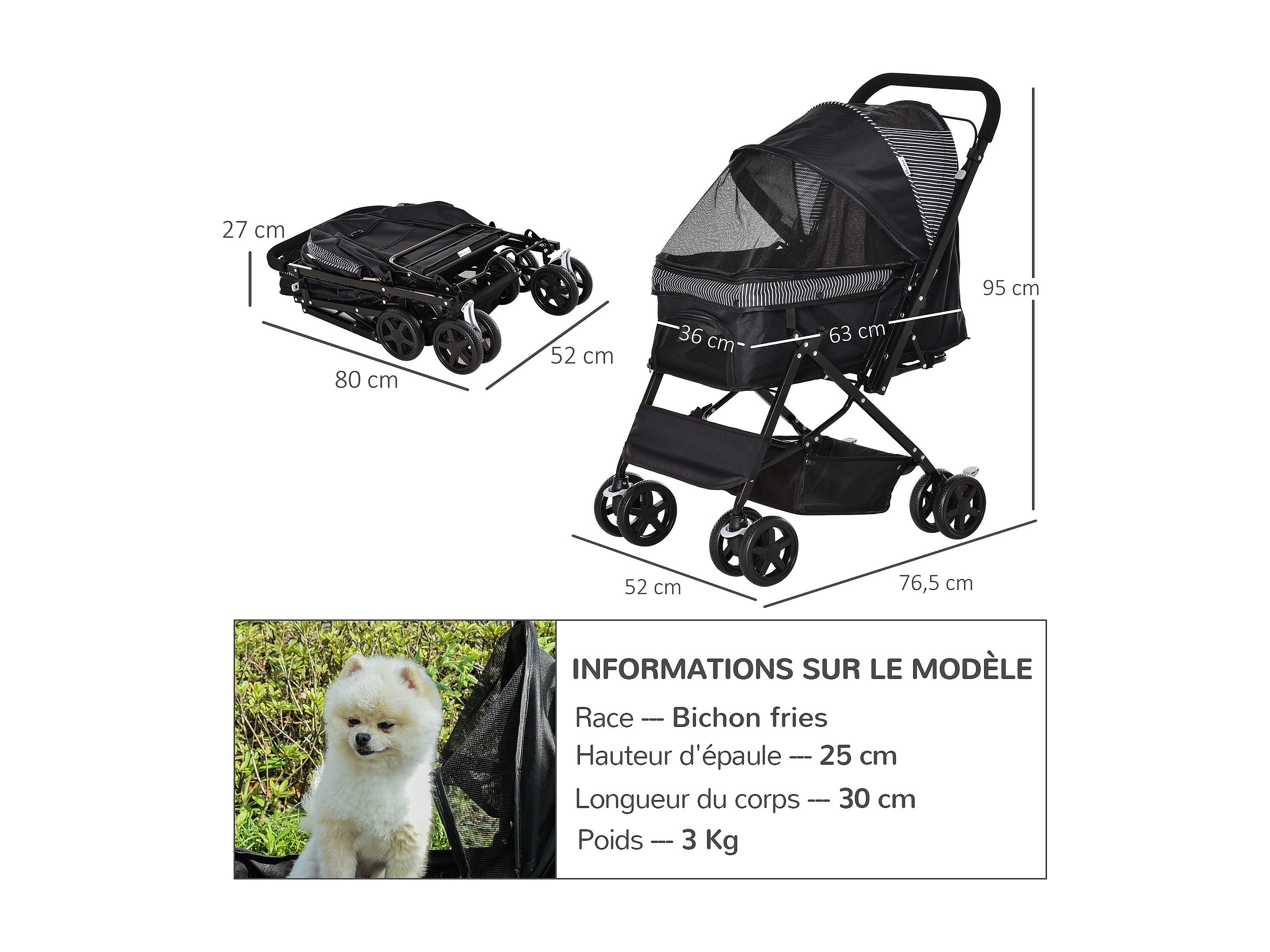 Poussette pliante pour chien et chat, avec coussin, fenêtres en filet et rangement, polyester, noir (81x48x99 cm)