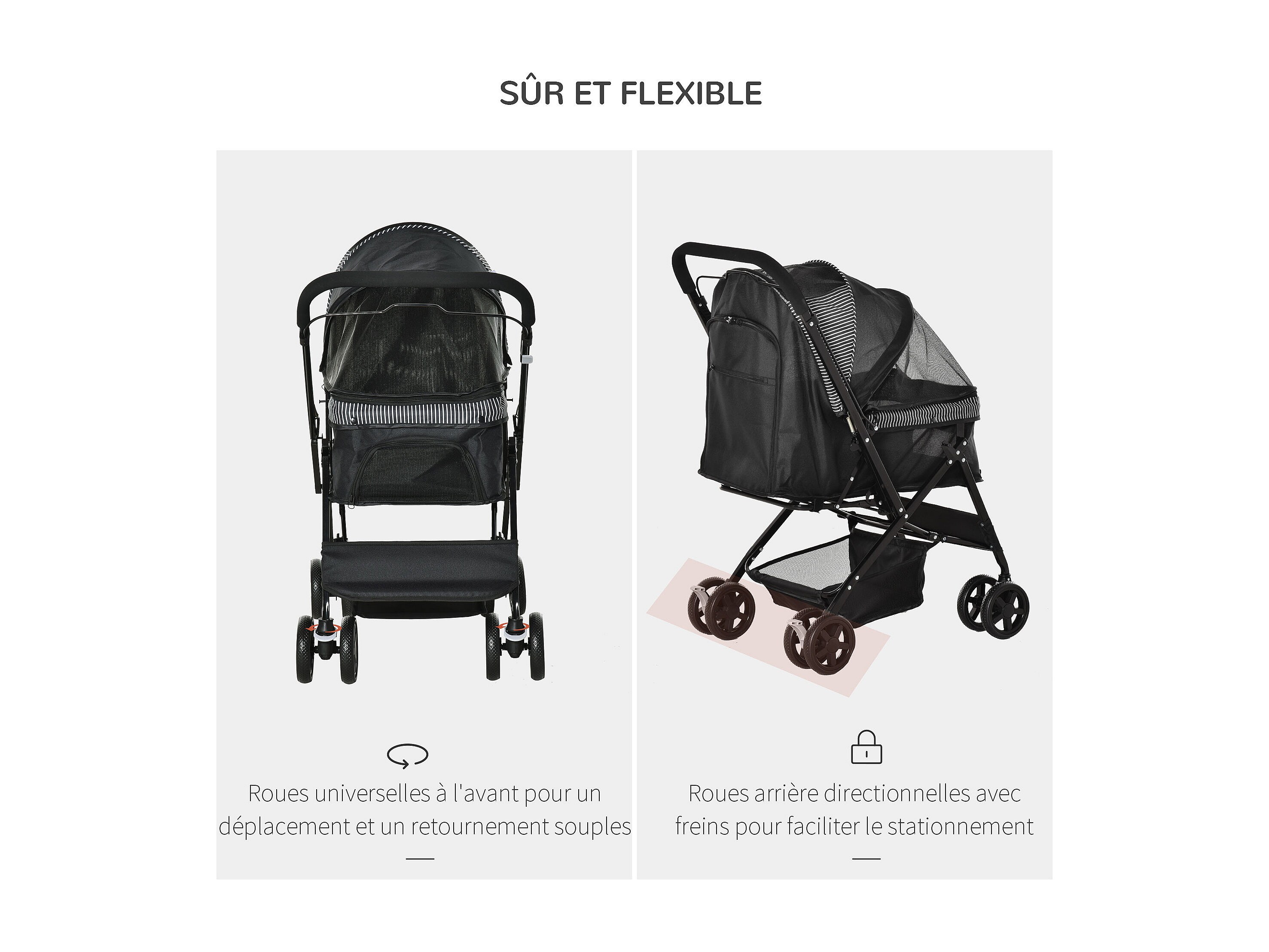 Poussette buggy pliable chien chat panier et sac de rangement attaches sécurité housse réglable poignée réversible acier Oxford noir