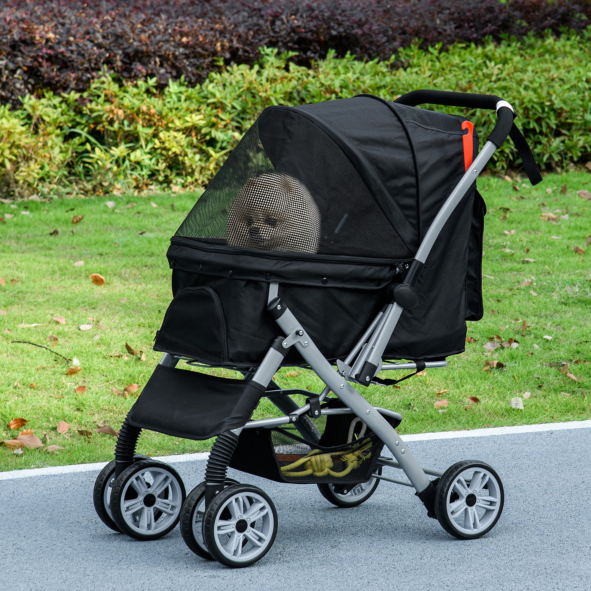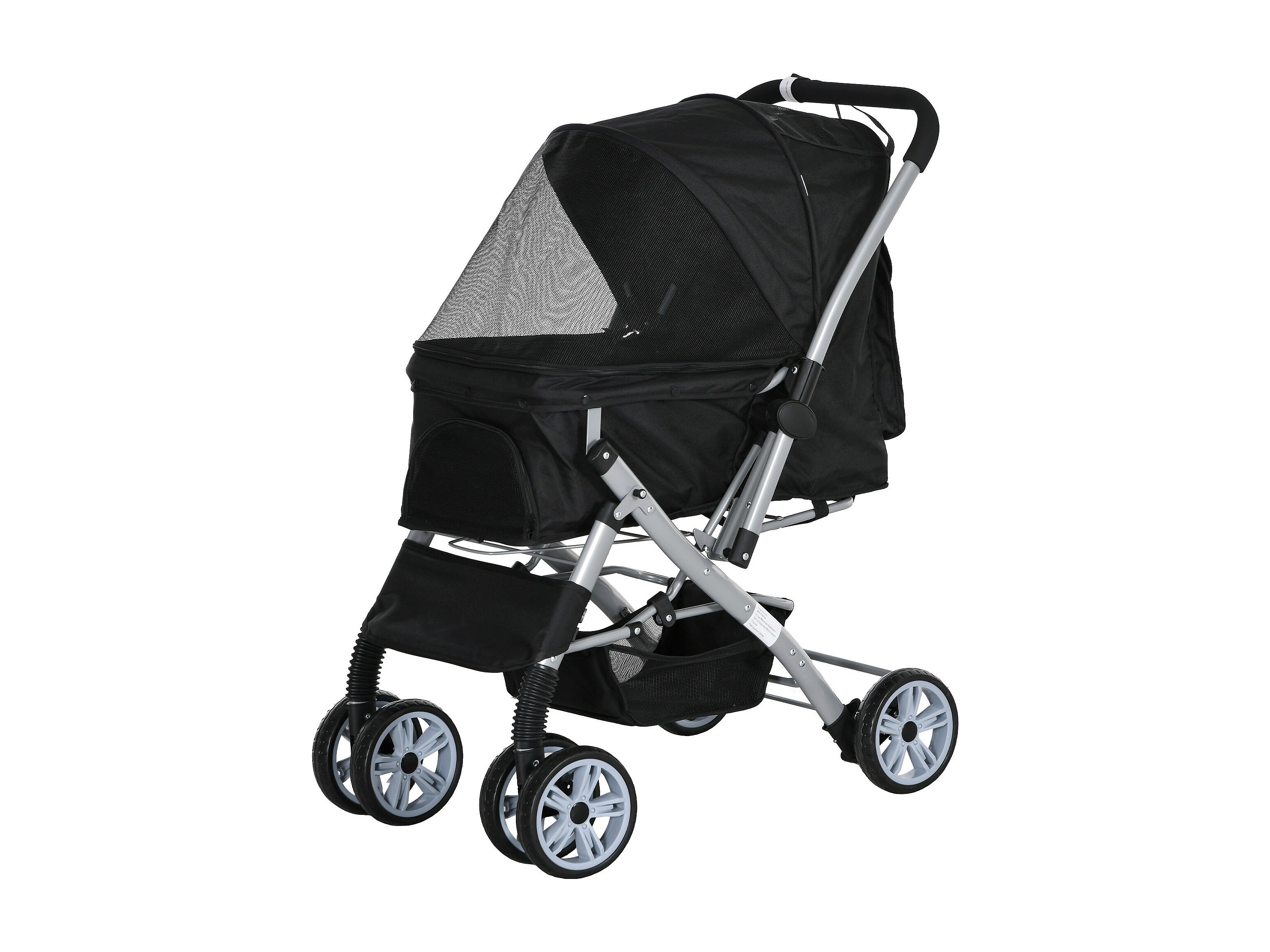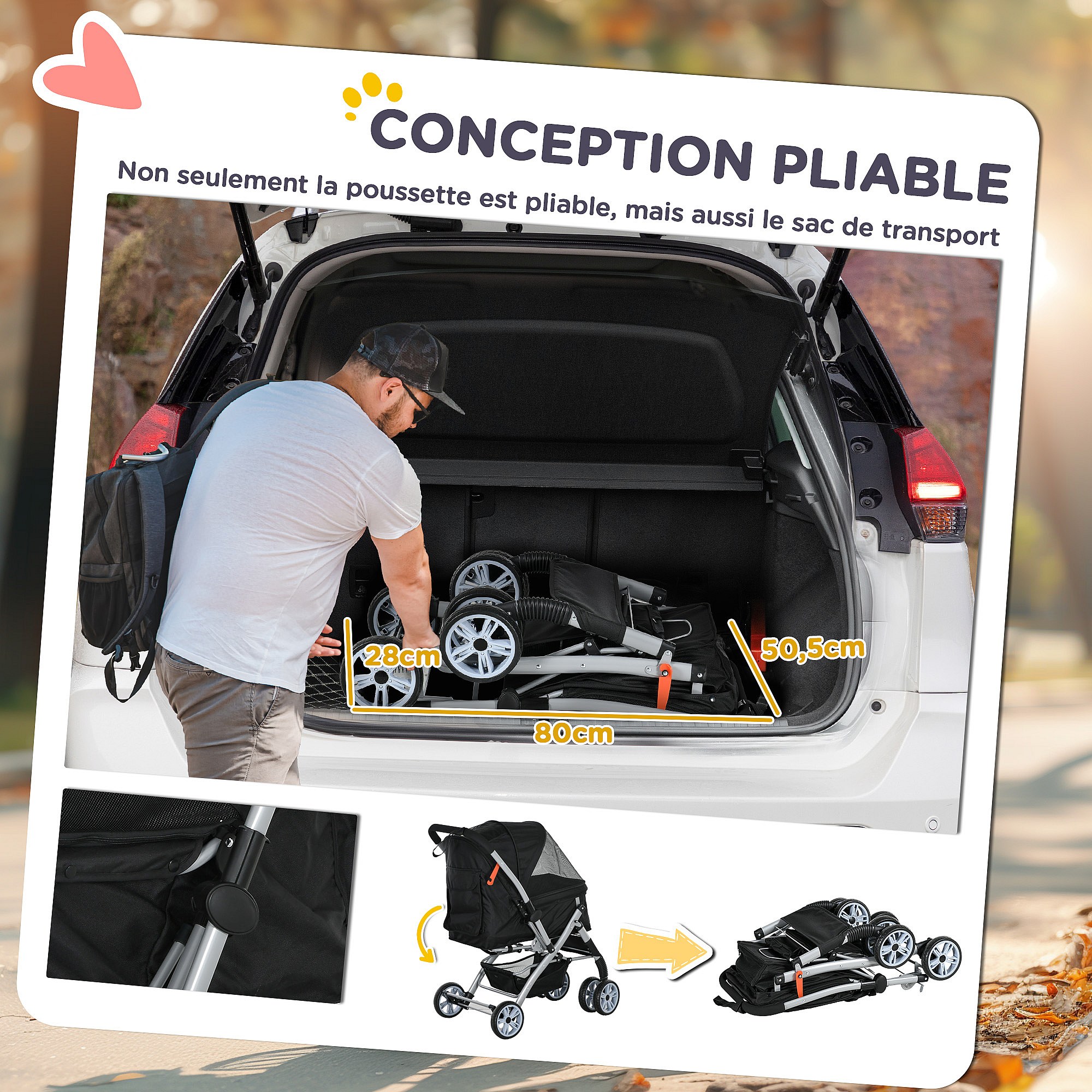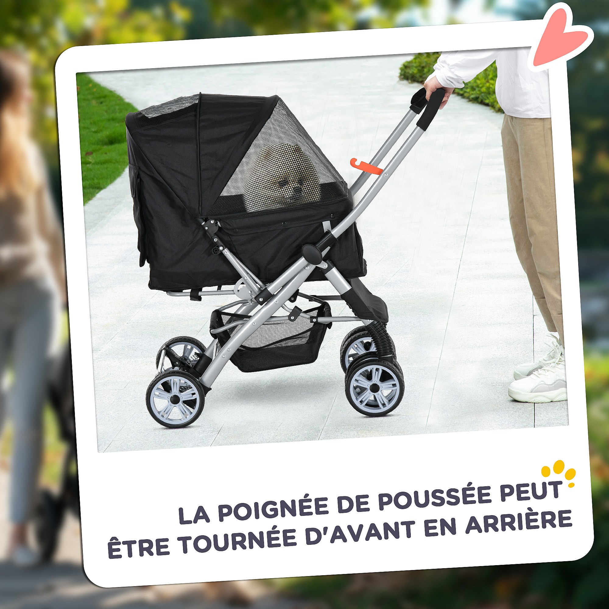 Poussette buggy pliable chien chat panier et sac de rangement attaches sécurité housse réglable poignée réversible acier Oxford noir