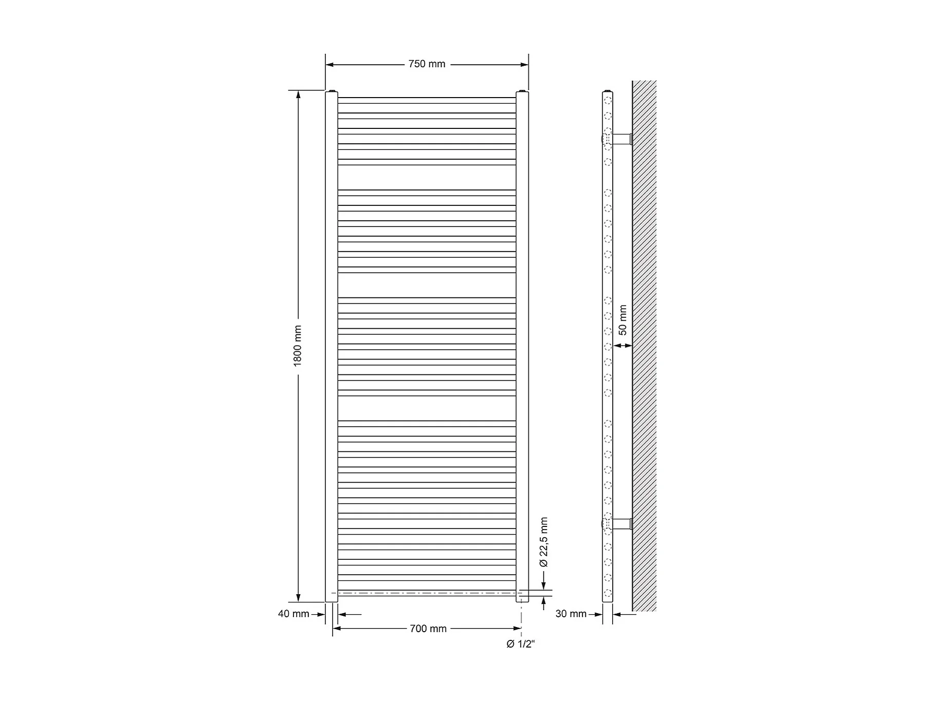 Radiateur Sèche-Serviettes Sahara, 750 x 1800 mm, Blanc, Droit avec Raccordement Latéral