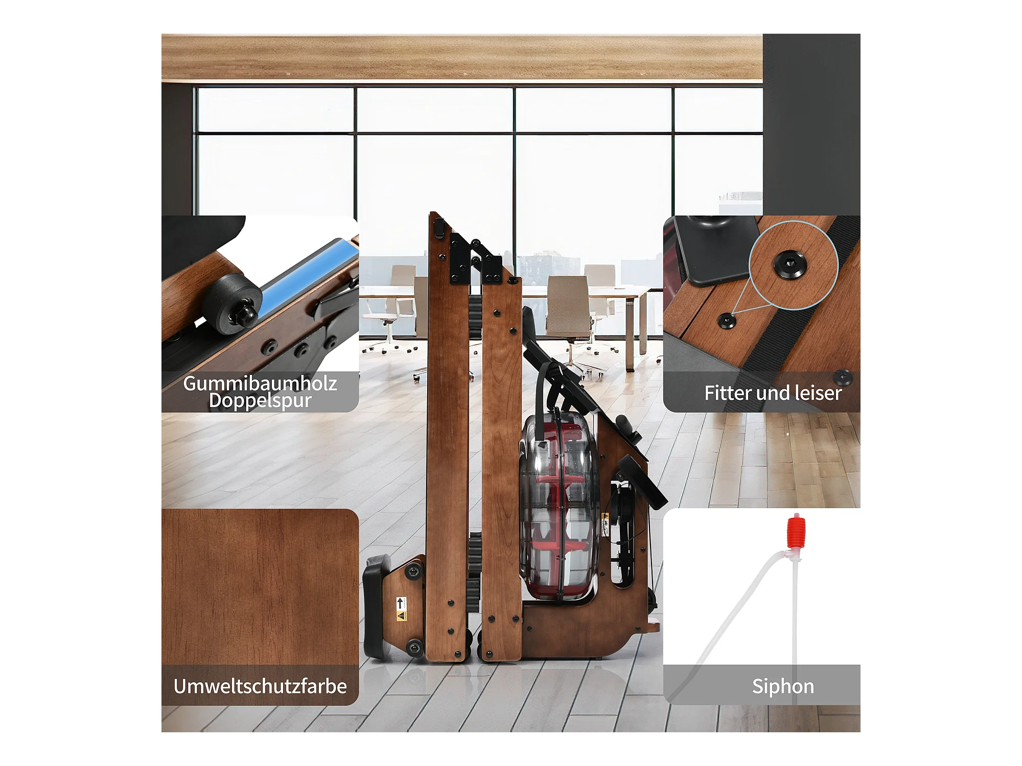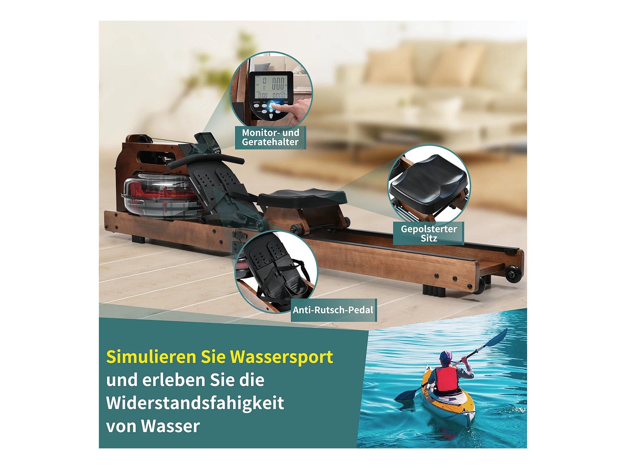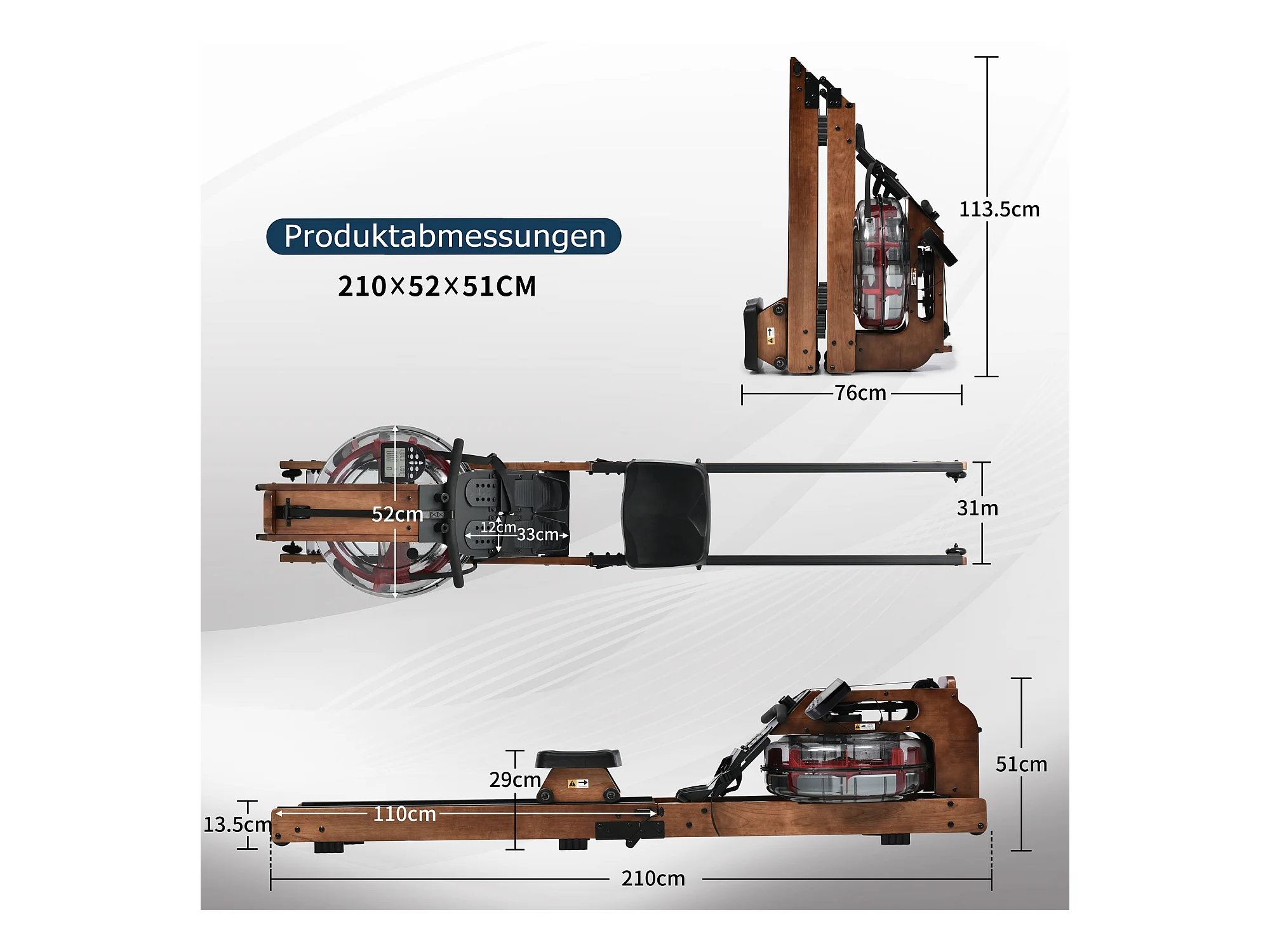Rameur pliable à résistance d'eau avec application Kinomap, bois de noyer, intérieur fitness (210x52x51cm)