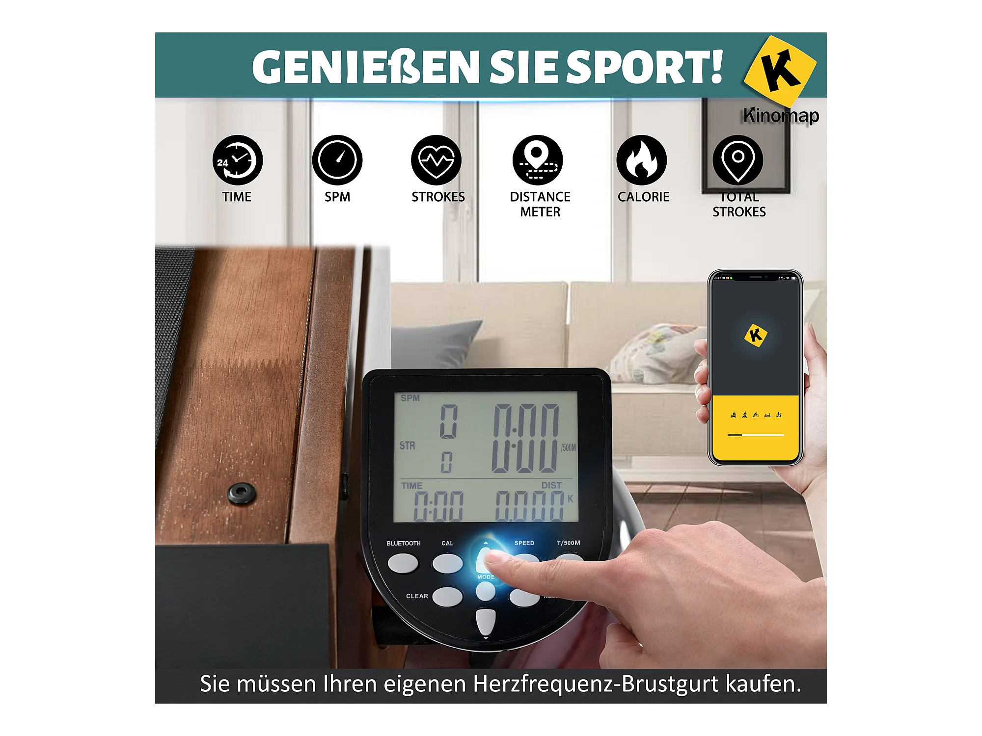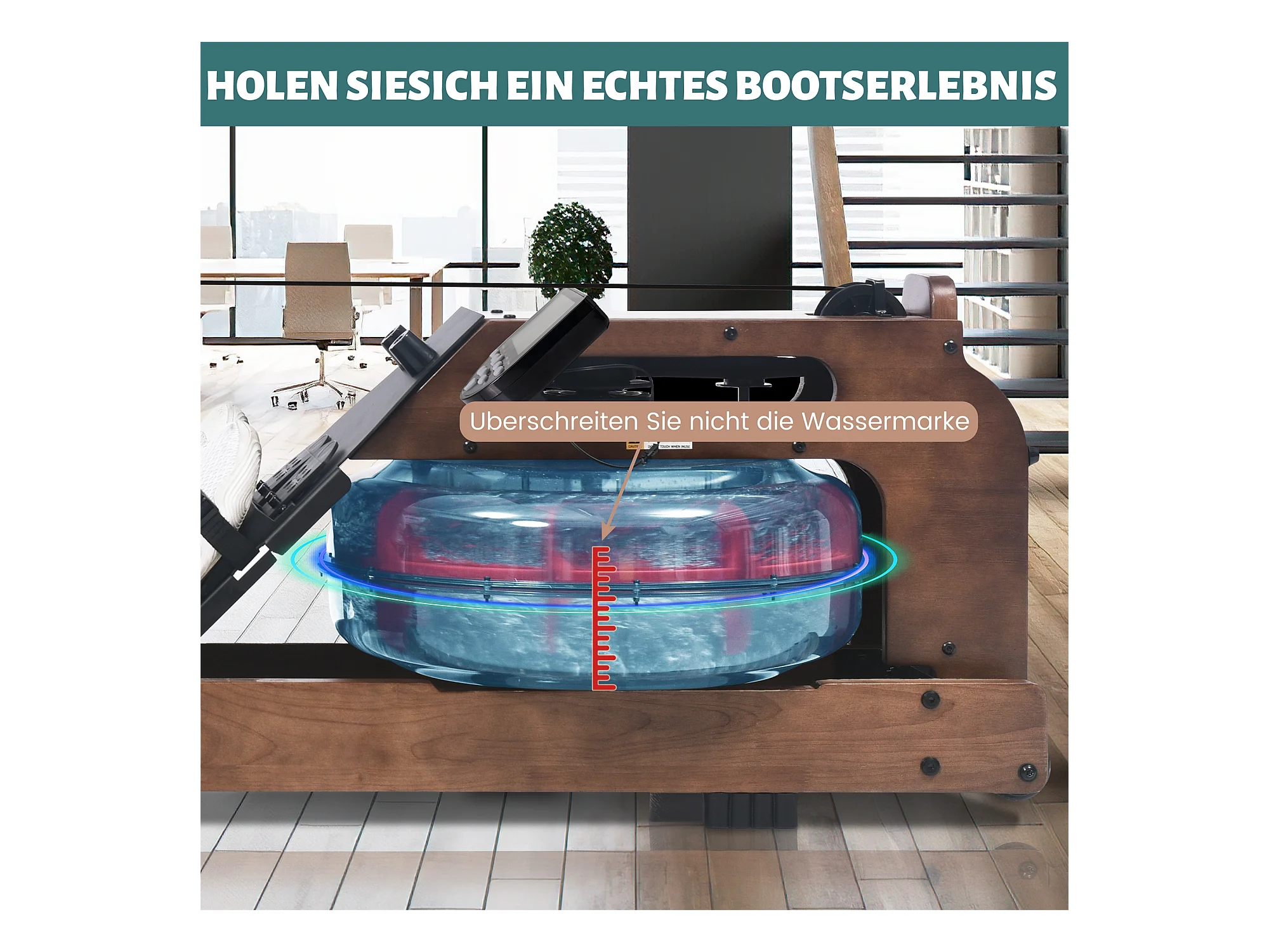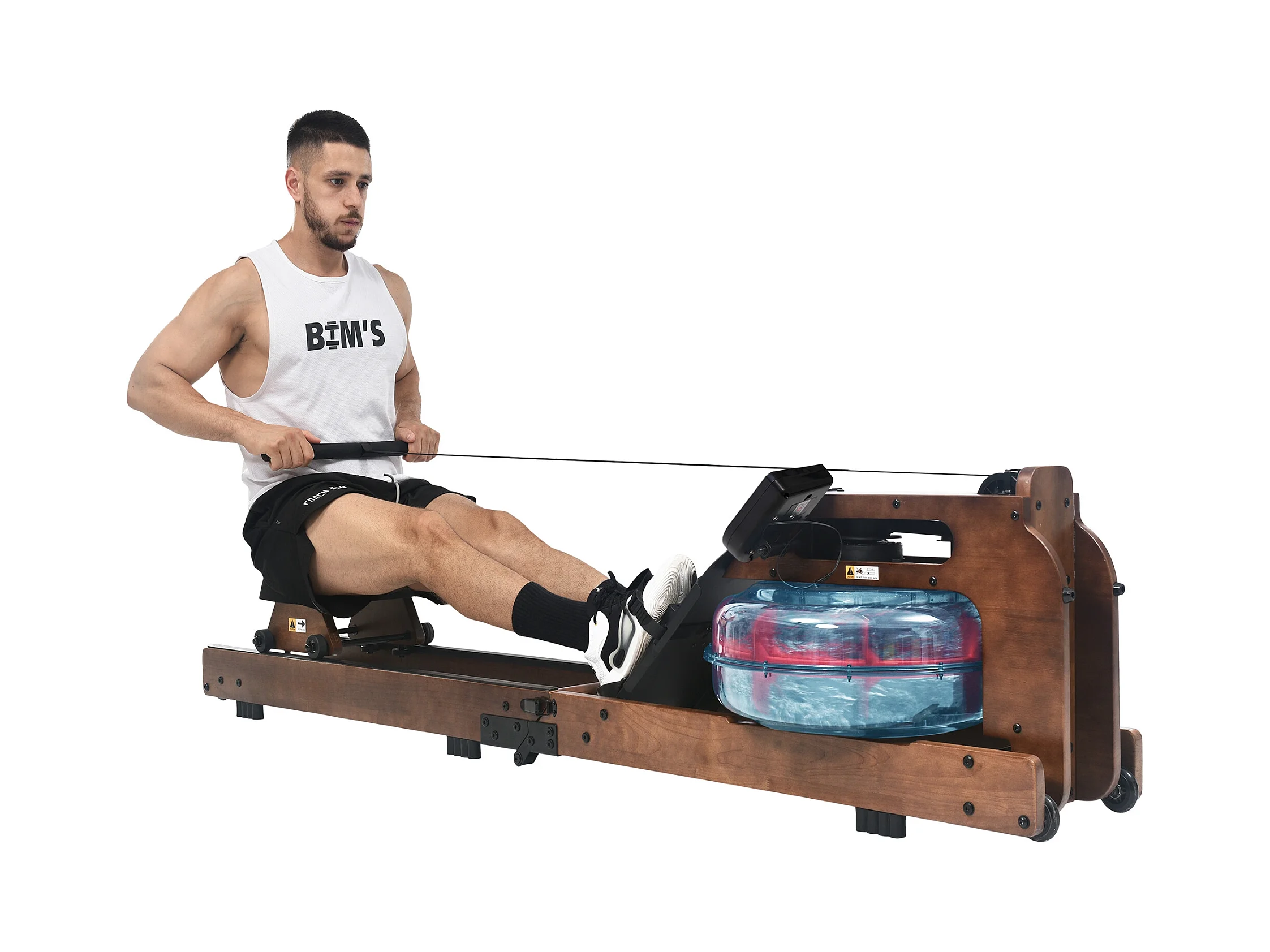 Rameur pliable à résistance d'eau avec application Kinomap, bois de noyer, intérieur fitness (210x52x51cm)
