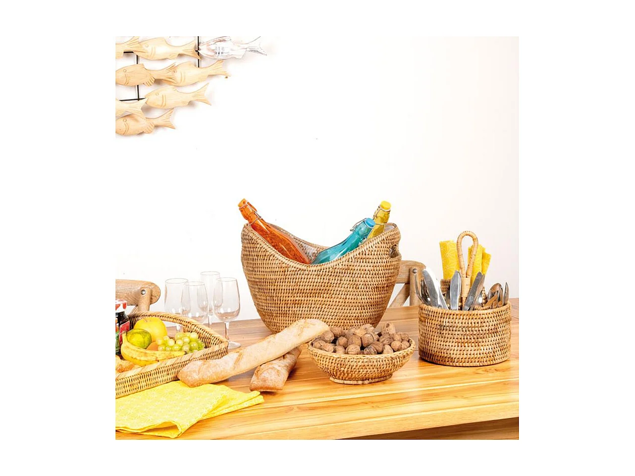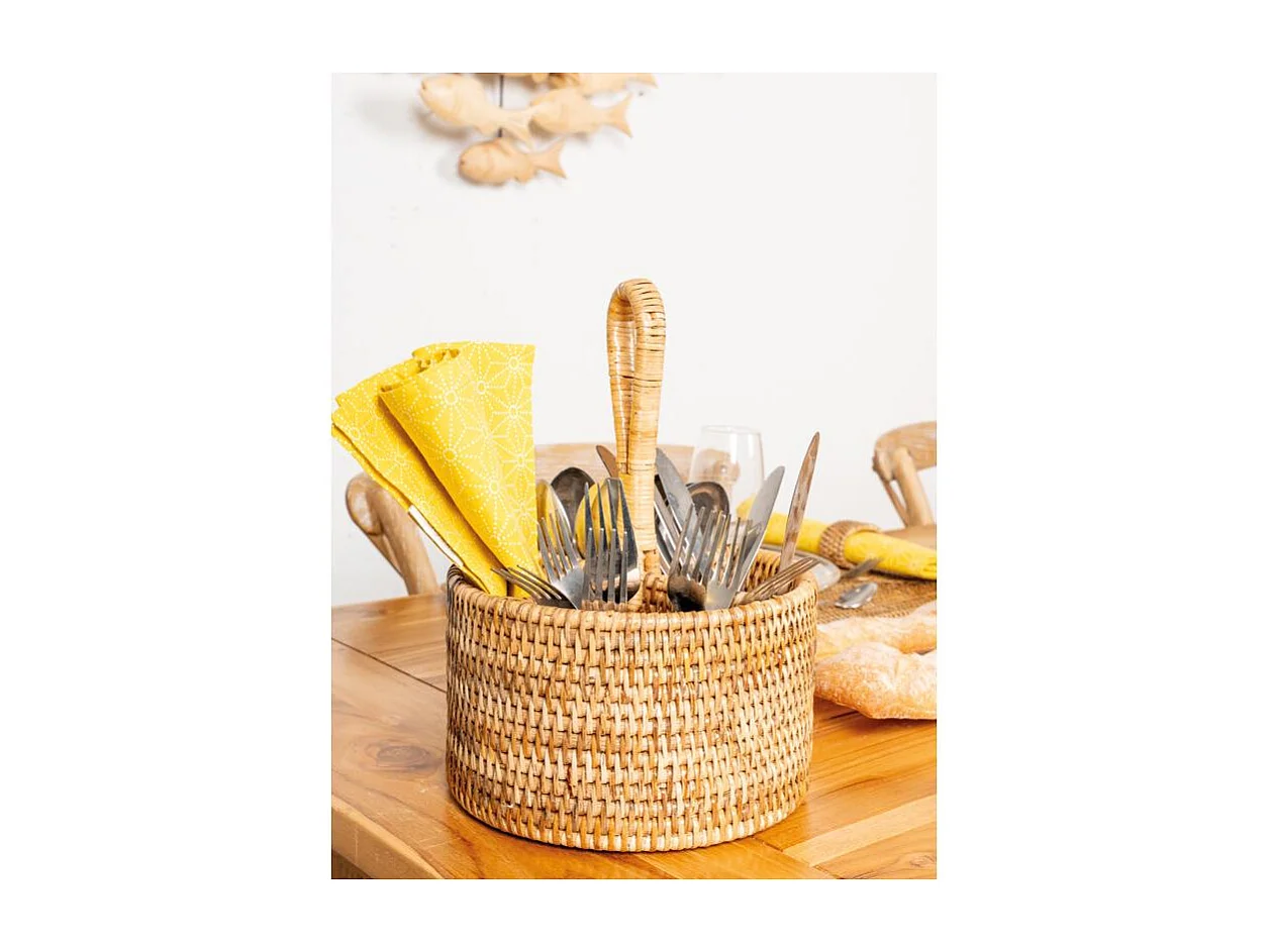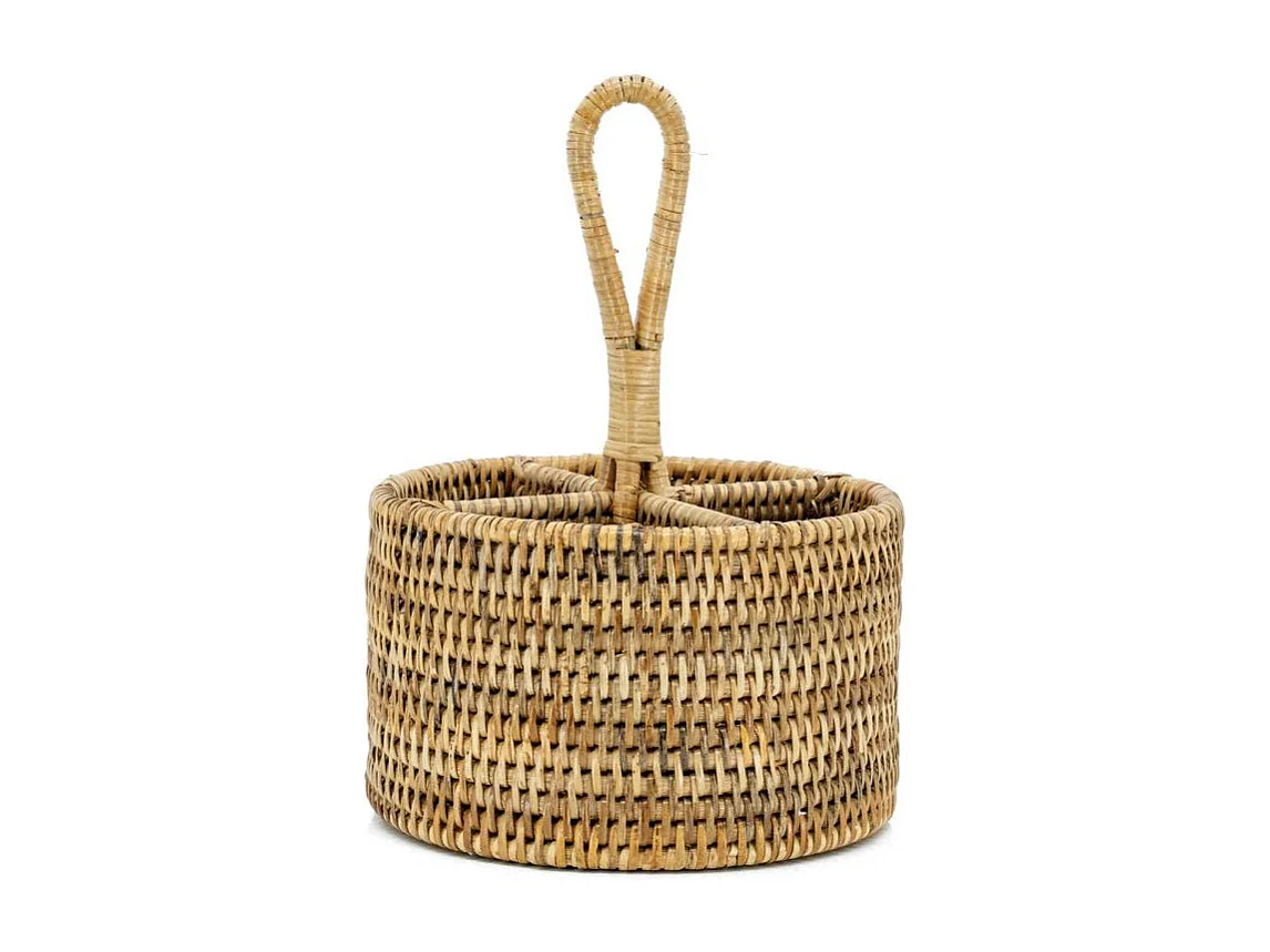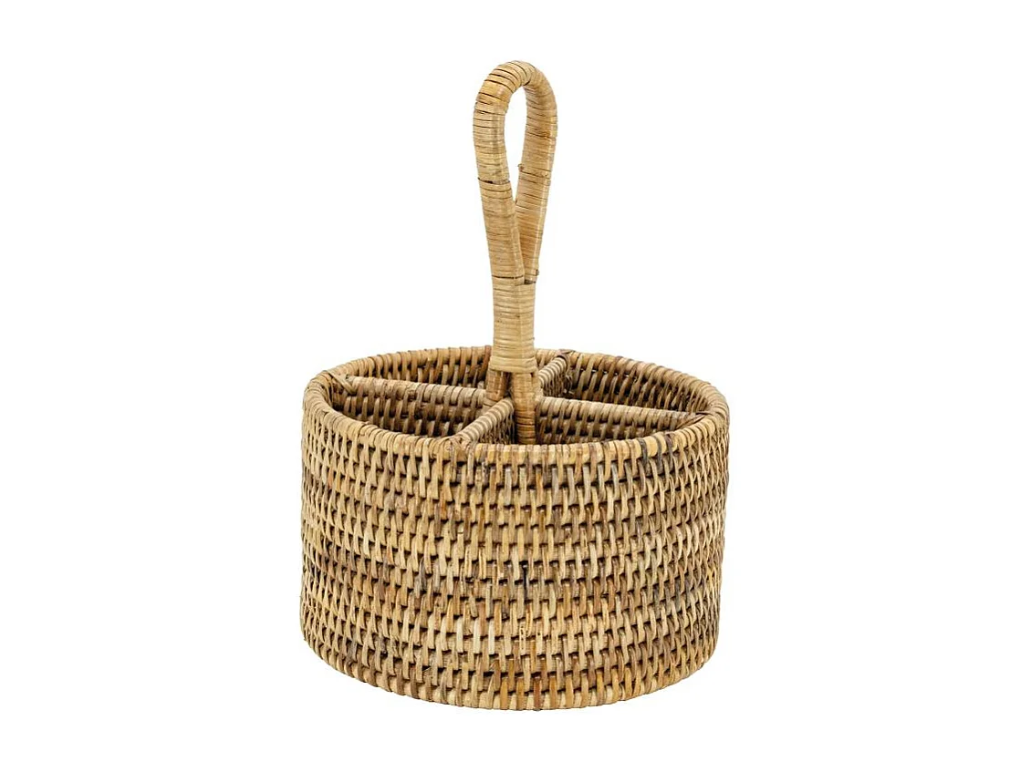 Range-couverts rond en rotin naturel avec 4 compartiments et poignée