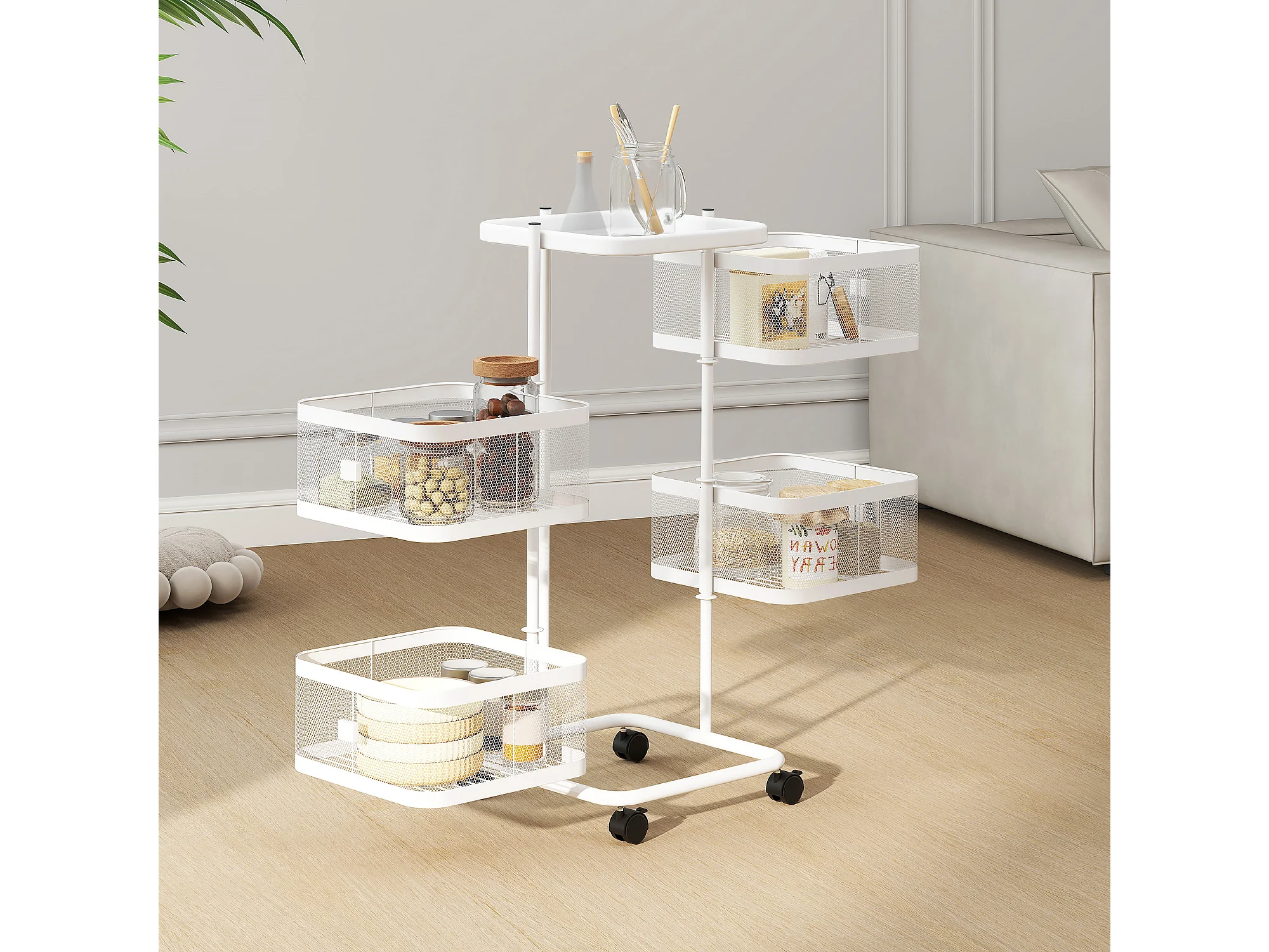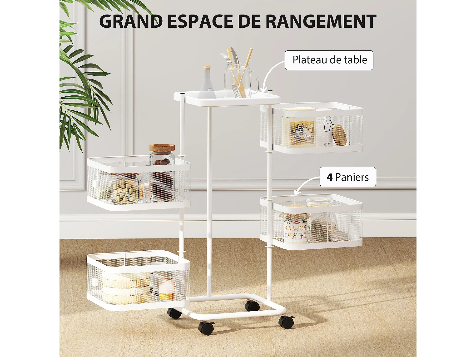 Resserre de cuisine 4 paniers rotatifs sur roues en métal H.77cm blanc